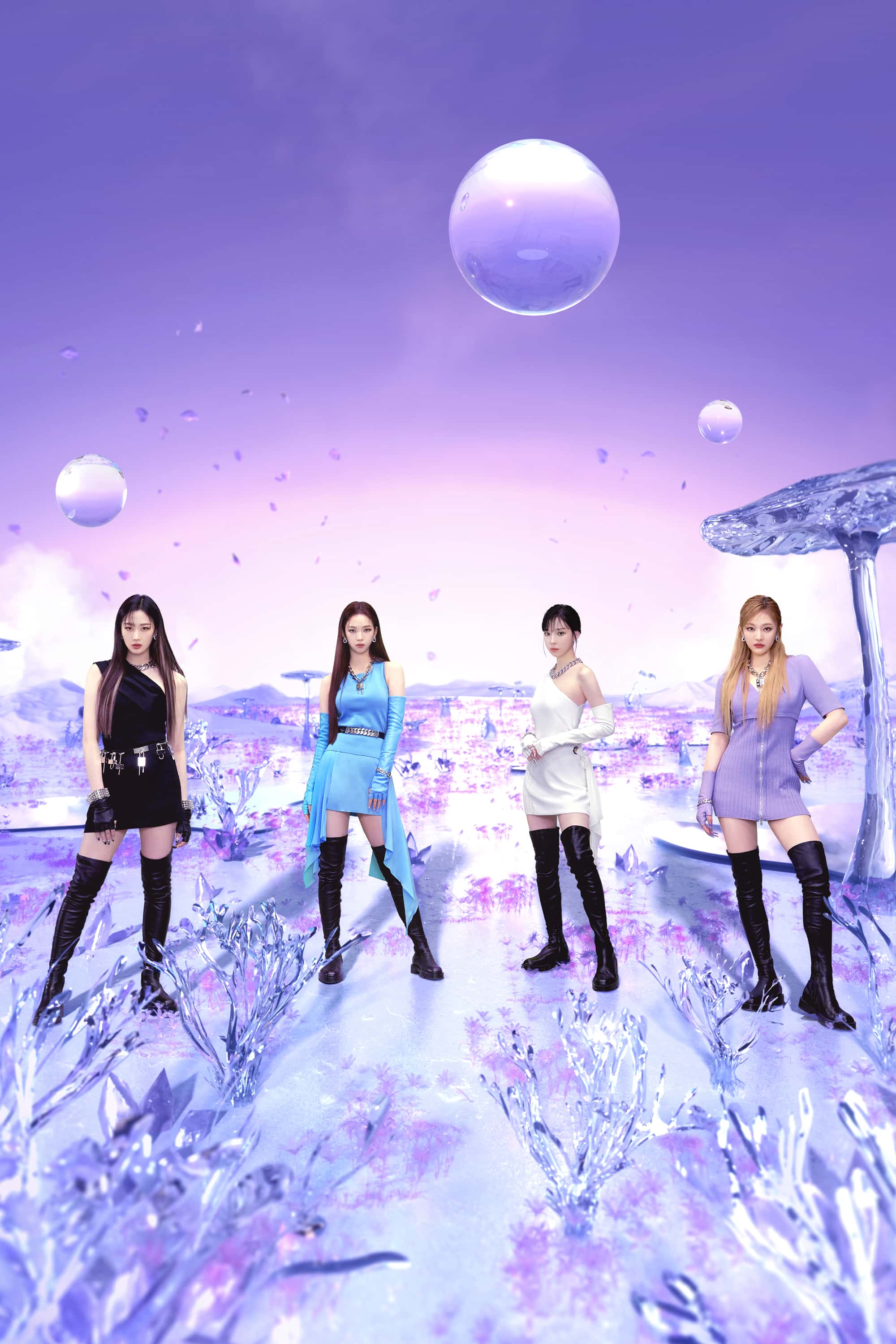 Korean fans pointed out that SM Entertainment has invested a lot in the group as we’ve been getting several video teasers, six concept photos and a CGI-filled music video. In the first concept images for ‘Hallucination Quest’ we saw the girls make references to the ‘Matrix’. In the ‘Synk Dive’ concept, the girls wear glamorous headpieces as they get ready to sync with their AI aka AE counterparts. aespa is then seen wearing dark leather outfits as they pose with their AE counterparts. Finally, they released teasers for the music video as they’re in a pastel world dressed in chic outfits.