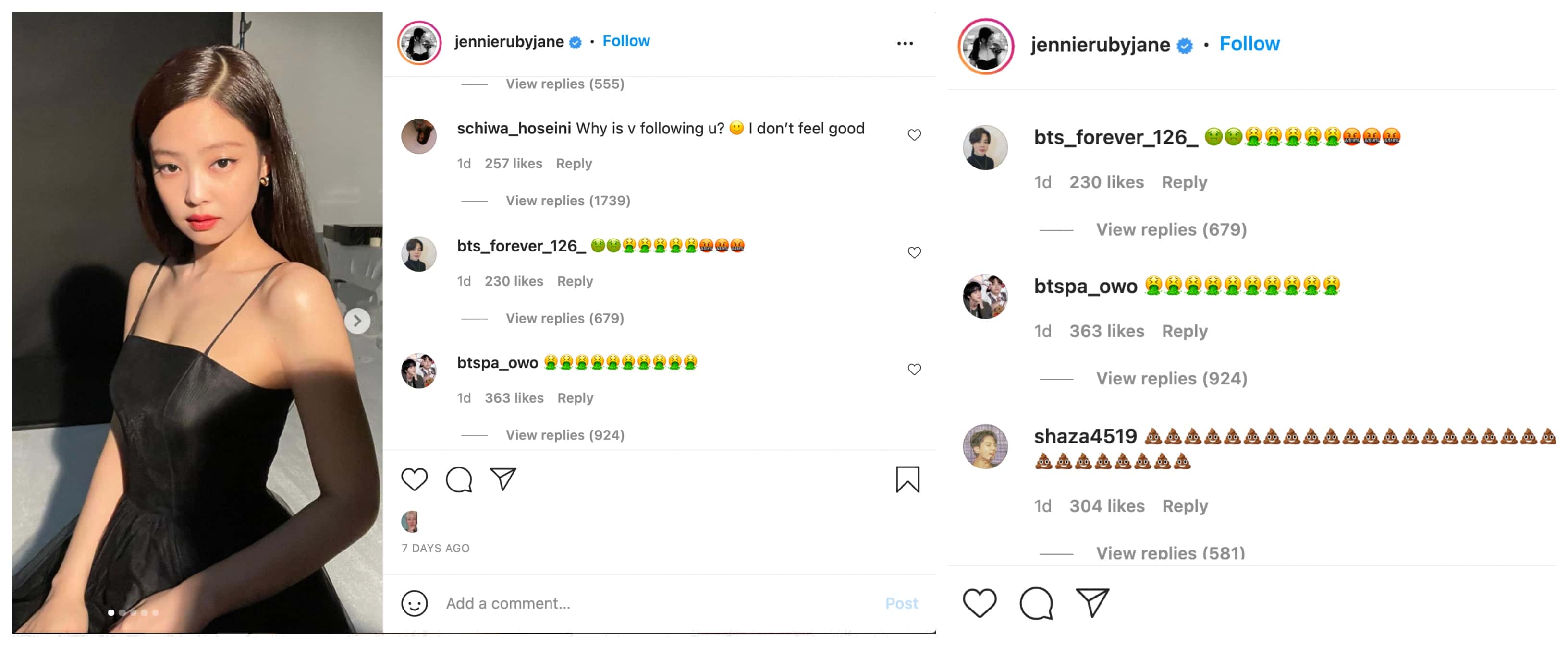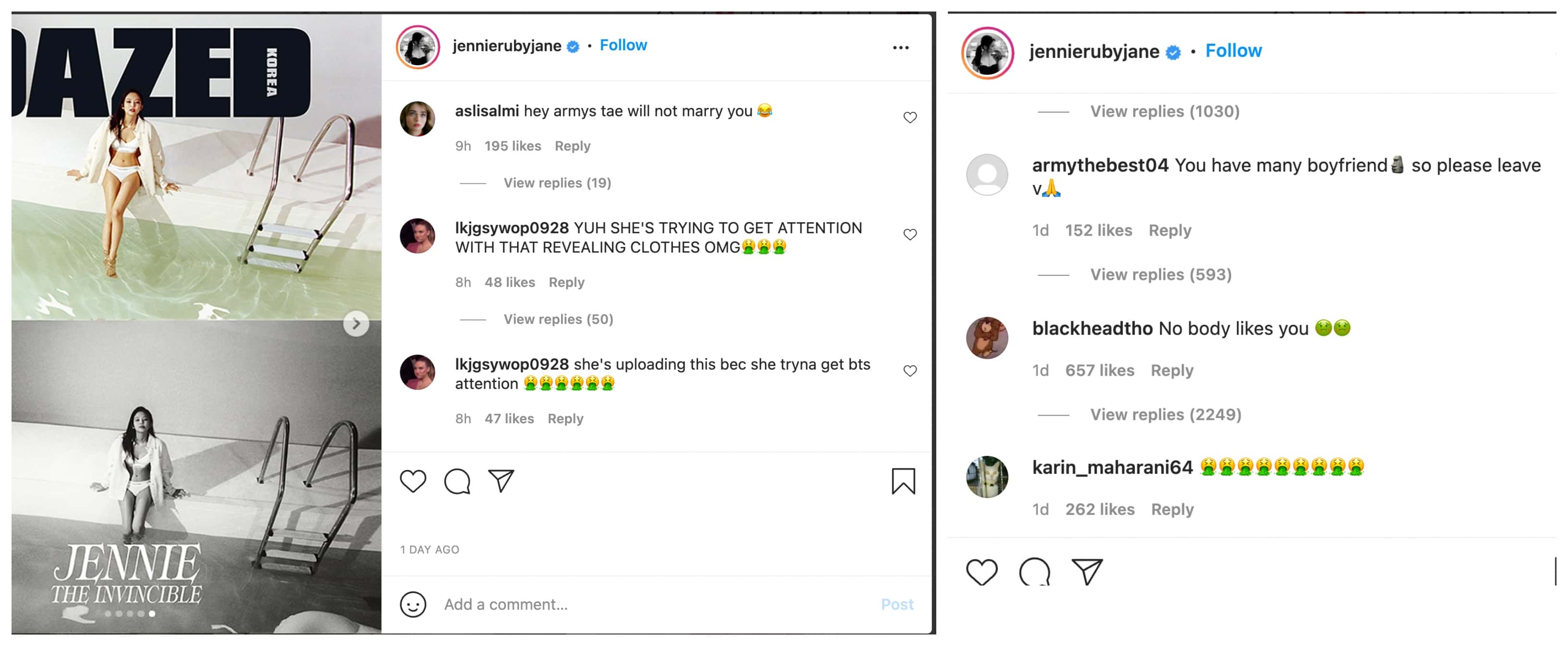 This accidental following and then the unfollowing fiasco was all taken in good fun by most ARMYs until toxic fans of BTS on Instagram started directing vicious comments at Jennie, even though none of it was her fault at all. The comments on Jennie’s posts have exploded with toxic ARMYs blaming the singer for appearing on V’s suggestions. Jennie's page was bombarded by juvenile hate posts made by BTS fans that slut-shamed the Blackpink member for posing in Calvin Klein lingerie, a brand that she endorses globally.