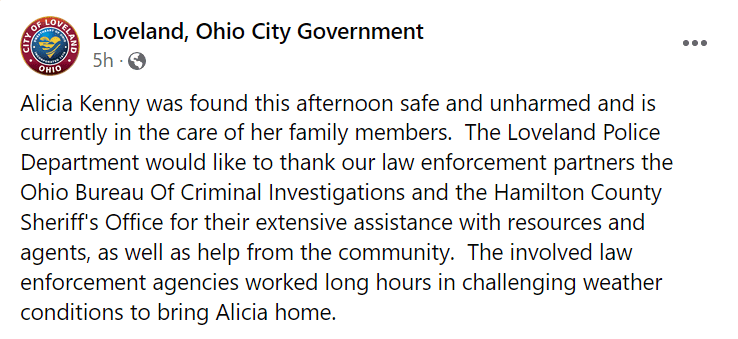 Loveland, Ohio City Government has now said in a statement on social media that Kenny has been found safe. "Alicia Kenny was found this afternoon safe and unharmed and is currently in the care of her family members. The Loveland Police Department would like to thank our law enforcement partners the Ohio Bureau Of Criminal Investigations and the Hamilton County Sheriff's Office for their extensive assistance with resources and agents, as well as help from the community. The involved law enforcement agencies worked long hours in challenging weather conditions to bring Alicia home," they wrote on Facebook.