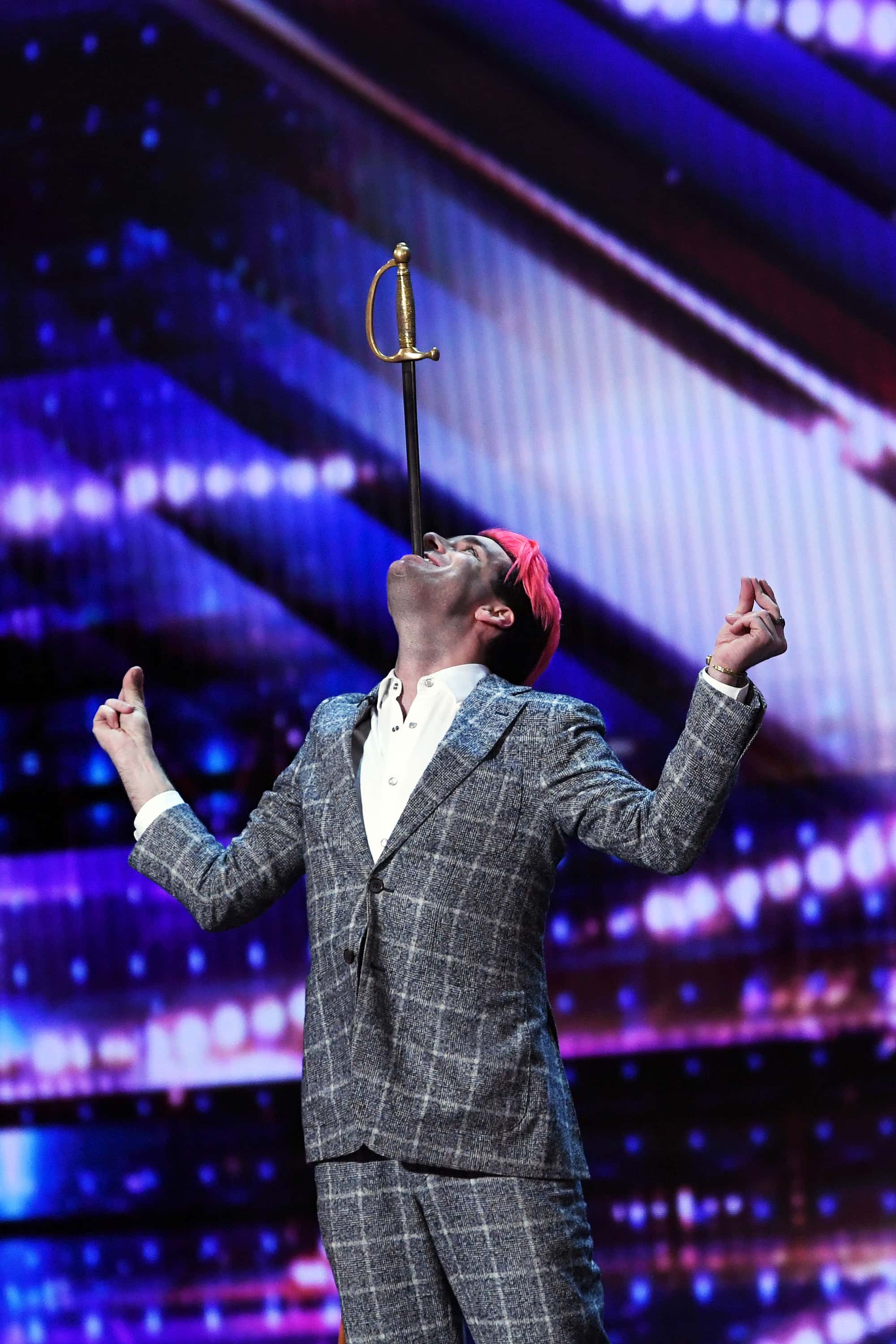 'America's Got Talent' capped off its latest episode on Tuesday with a spectacular flourish, courtesy Brett Loudermilk, a professional sword swallower from North Carolina. The young performer with a bold mop of pink-dyed hair is a born entertainer, following in his showman grandfather's footsteps. He also mentioned his dad, who is now a cop, always dreamed of being a rock star and Brett certainly has a magnetic rock star vibe to him, full of confidence and charisma.