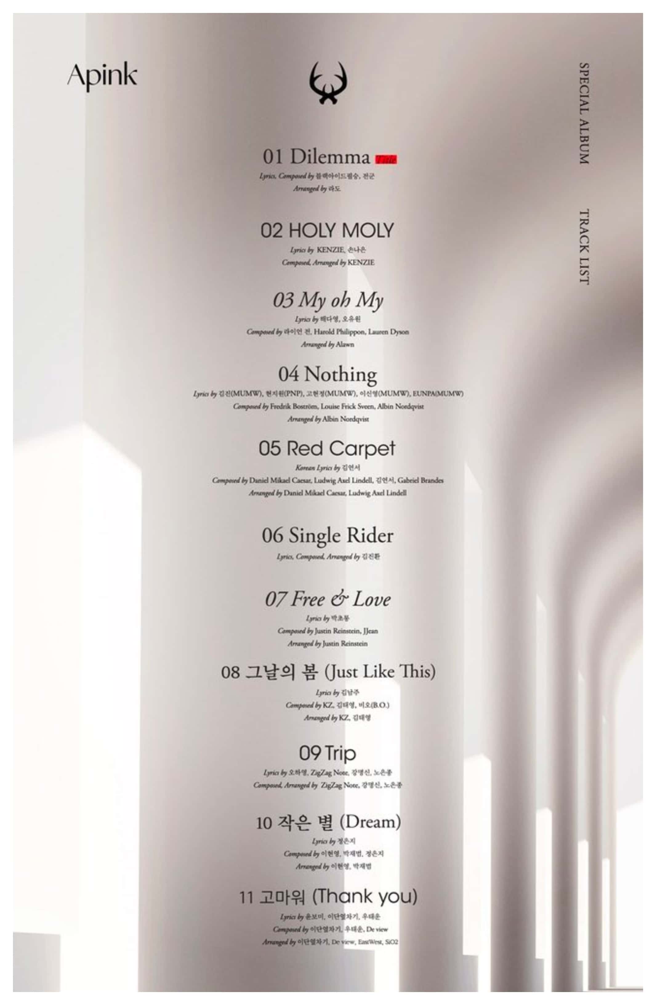 In the tracklist released from IST Entertainment, it can be seen that Apink is making their comeback with a full-length album, their fourth one. ‘Horn’ consists of 11 tracks, with ‘Dilemma’ as the lead single that expresses the 'dilemma' in one’s heart that wishes to love but is faced with the situation that demands it simply give up on love. The lead single is producer Black Eyed Pilseung and Jeon Gun, who showed fantastic synergy with Apink in their past songs. In addition to composer Kenzie, who worked on songs for top idol groups such as Taeyeon, NCT U, and Girls' Generation, famous global producers such as Gabriel Brandes and Kim Jinhwan have also participated in many of the tracks for Apink on this album.