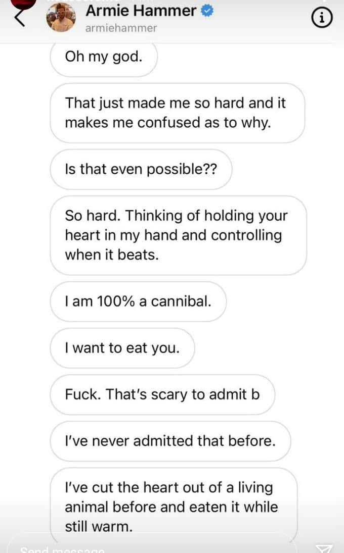 In case you missed it, this tweet from a social media user puts it quite succinctly. "Ugh Armie Hammer. He originally started trending awhile back due to some very creepy sexts being leaked and it's a whole thing. Even if you put cannibalism kink aside, he wants to be a dom without the consent, boundaries, and safety essentially."