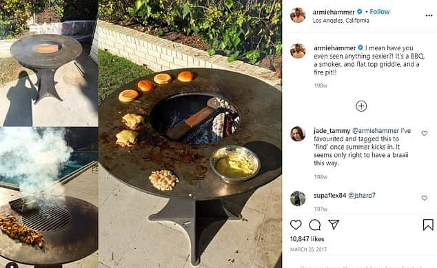 Hammer has repeatedly posted about his love for meat online. His social media is full of images of raw meat, pigs' heads and knives, it has been revealed, days after leaked messages said to be from the star, show him claiming to be "100 percent a cannibal". The 34-year-old's Instagram handle shows several pictures of raw and grilled meat. In one of the snaps which display barbecuing meat, he had written: "Have you ever seen anything sexier?"