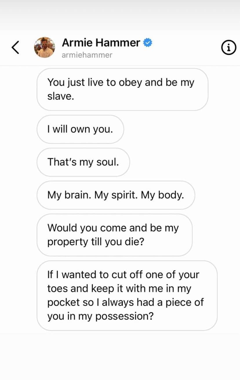 It all started last week when the Instagram account @houseofeffie posted a series of screenshots of direct messages that said Hammer had sent women from 2016 to 2020. The messages in the screenshots, which are unverified, seemed to display fantasies of rape, domination and cannibalism.