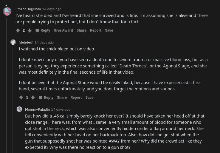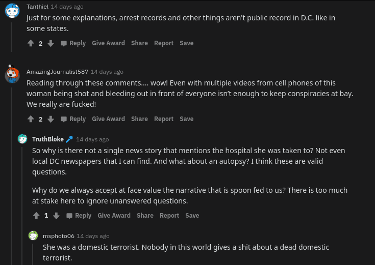 One user argued, “Reading through these comments.... wow! Even with multiple videos from cell phones of this woman being shot and bleeding out in front of everyone isn’t enough to keep conspiracies at bay. We really are f--ked!” another defended those comments saying, “So why is there not a single news story that mentions the hospital she was taken to? Not even local DC newspapers that I can find. And what about an autopsy? I think these are valid questions. Why do we always accept at face value the narrative that is spoon-fed to us? There is too much at stake here to ignore unanswered questions.”