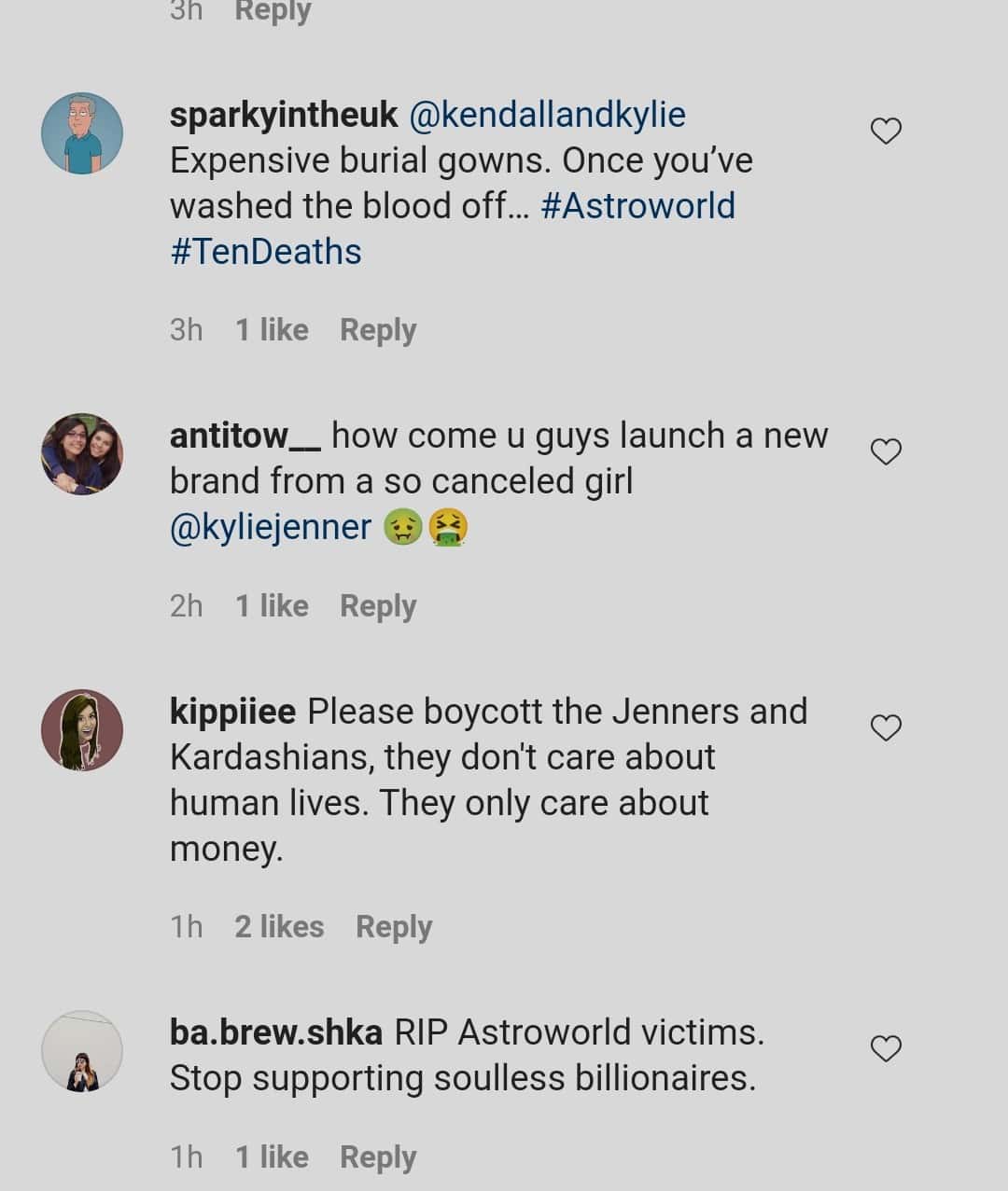 One user commented, "Please boycott the Jenners and Kardashians, they don't care about human lives. They only care about money." One user complained, "RIP Astroworld victims. Stop supporting soulless billionaires."