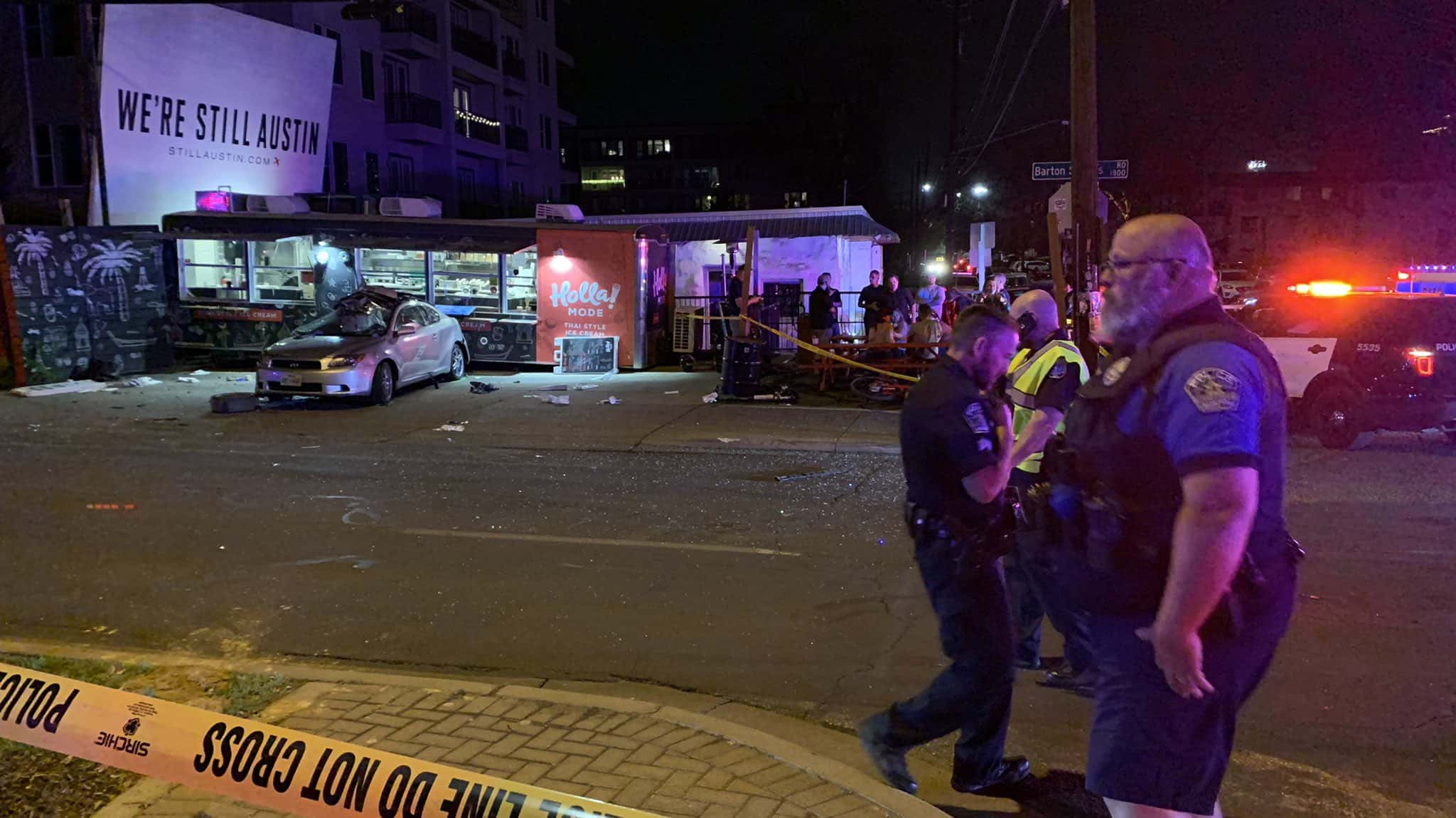 The crash occurred along Barton Springs in South Austin, near Zilker Park. Eyewitnesses say a white pickup truck was traveling at high speed and hit a sedan that was turning. As a result, the sedan spun off the road and crashed into the Holla Mode food truck nearby. The pickup careened onto a sidewalk, crashing into a nearby bicycle rack. Captain Christa Steadman of the Austin Police Department told reporters, "one of the vehicles was pushed into the pedestrians near the food truck."