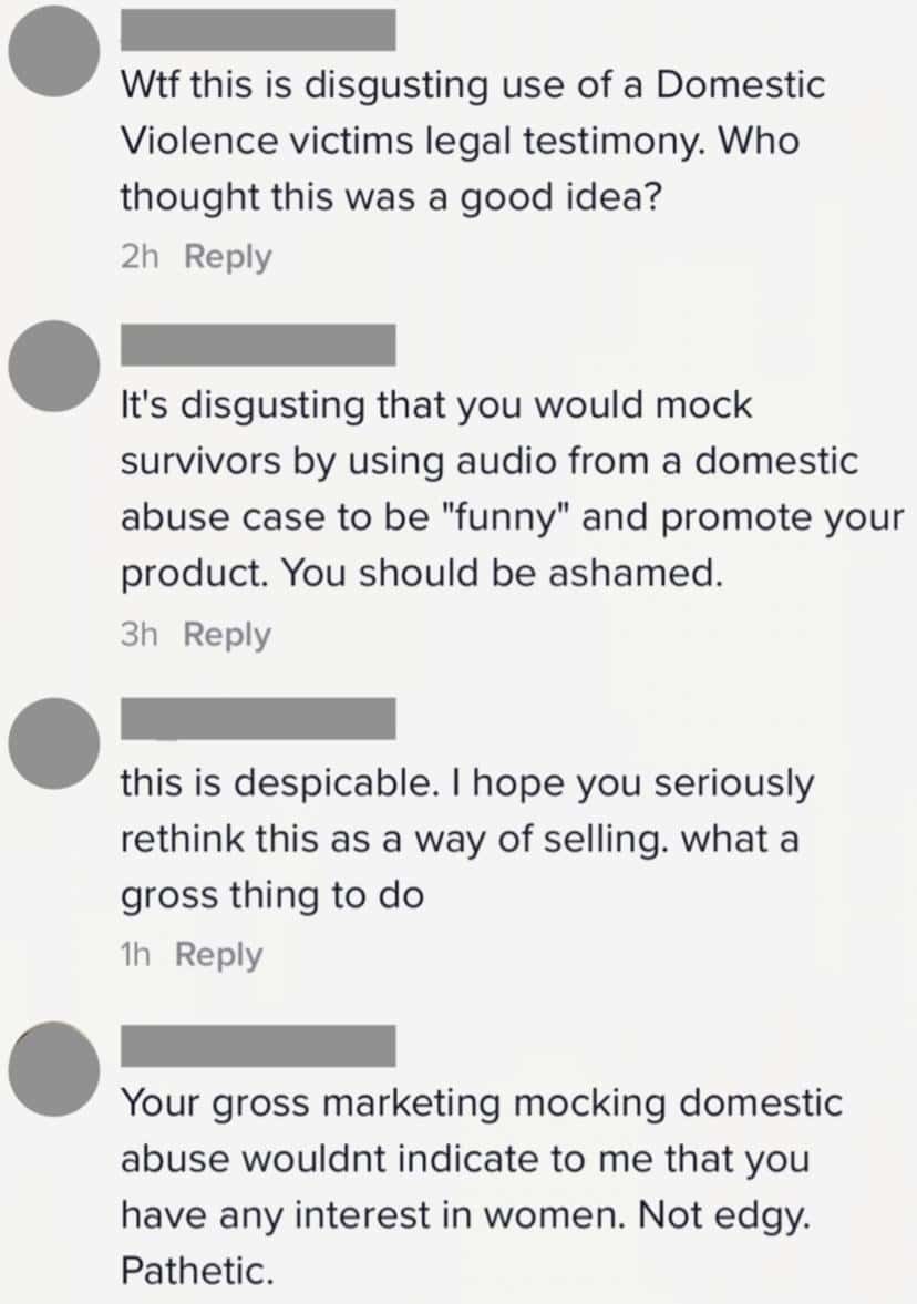 The video received considerable backlash as users slammed the company for "trying to profit off of domestic violence." "This is disgusting use of a domestic violence victim's legal testimony. Who thought this was a good idea?" one commenter wrote. “It's disgusting that you would mock survivors by using audio from a domestic abuse case to be 'funny' and promote your product. You should be ashamed,” another responded to the video. “This is despicable. I hope you seriously rethink this as a way of selling. What a gross thing to do,” said a third, while several others criticized the brand along similar lines.