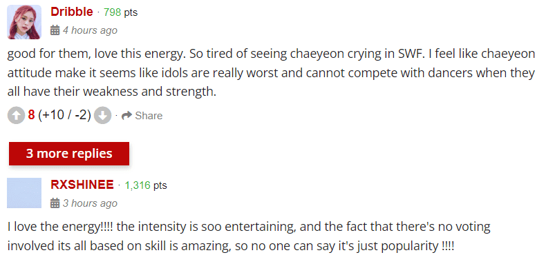 Users also made posts like “Good for them, love this energy. So tired of seeing chaeyeon crying in SWF. I feel like chaeyeon attitude make it seems like idols are really worst and cannot compete with dancers when they all have their weakness and strength,” and “I love the energy!!!! the intensity is soo entertaining, and the fact that there's no voting involved its all based on skill is amazing, so no one can say it's just popularity !!!!”