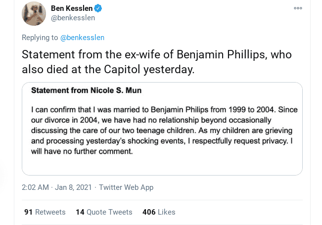 Benjamin Phillips exchanged vows with Nicole S Mun in 1999 but the two parted ways five years later. After his tragic death, a statement from his ex-wife found its way to social media. Posted by NBC News reporter Ben Kesslen, the tweet read: “Statement from the ex-wife of Benjamin Phillips, who also died at the Capitol yesterday.”