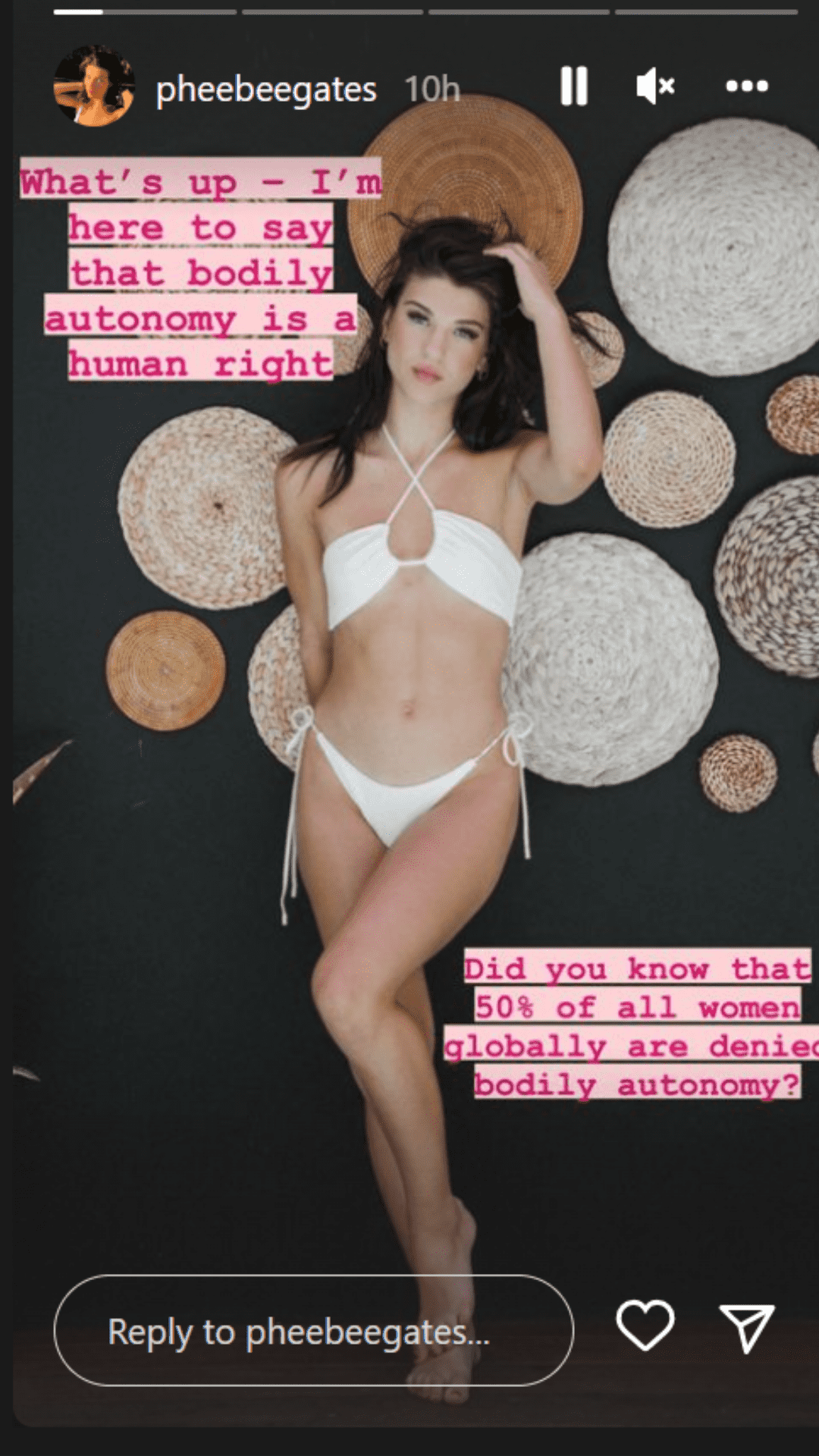 Within the picture, she could be seen in a white string halter bikini with a text on the photo saying "My Body My Choice". Phoebe also shared the same photos on Instagram stories as well. "Did you know that 50% of all women globally are denied bodily autonomy?", she wrote in her photo.
