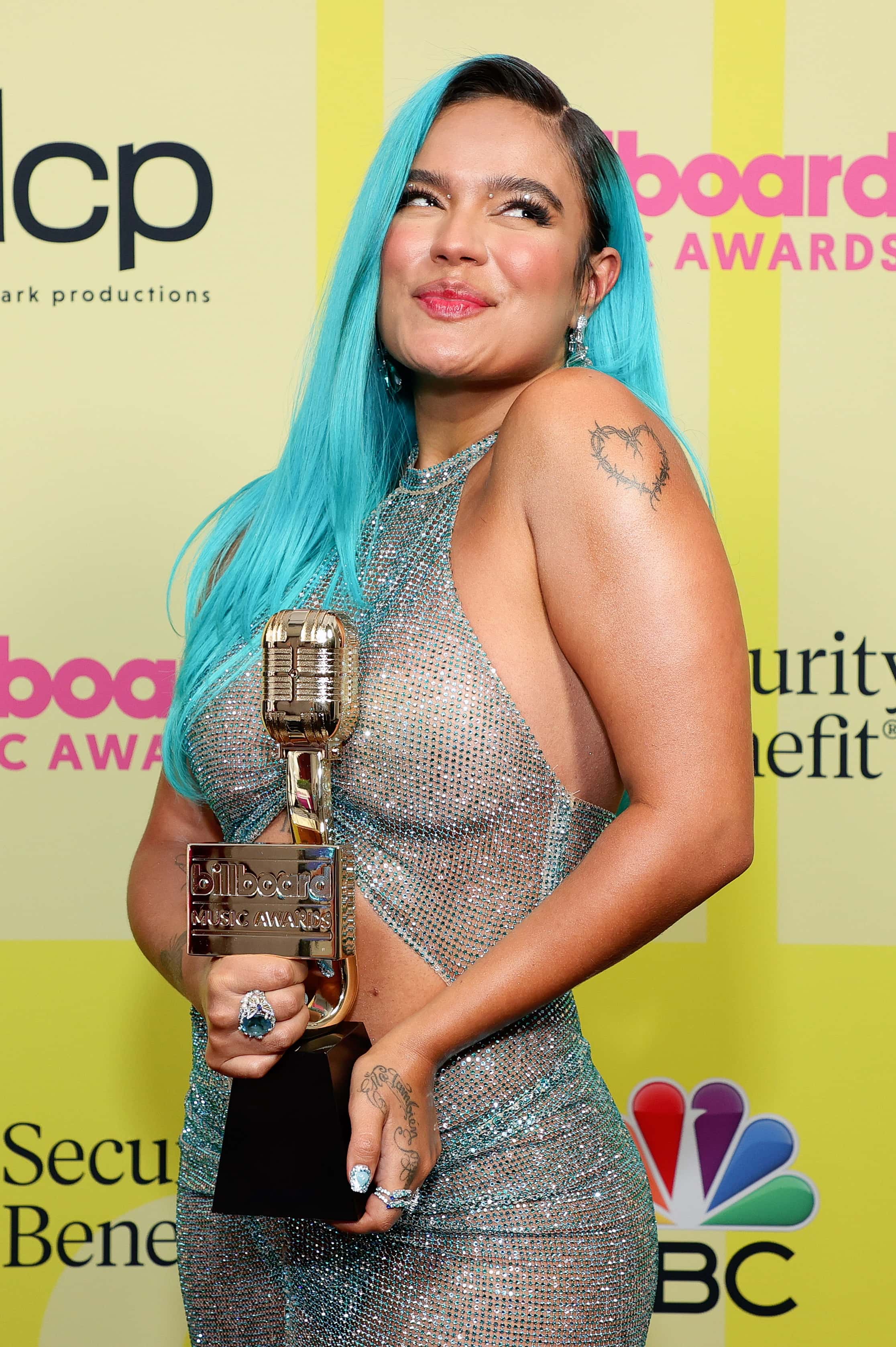 Karol G successfully made it to the internet's top chatter with winning Top Latin Female Artist at BBMAs 2021. She rocked a sultry silver see-through number for the Red Carpet.