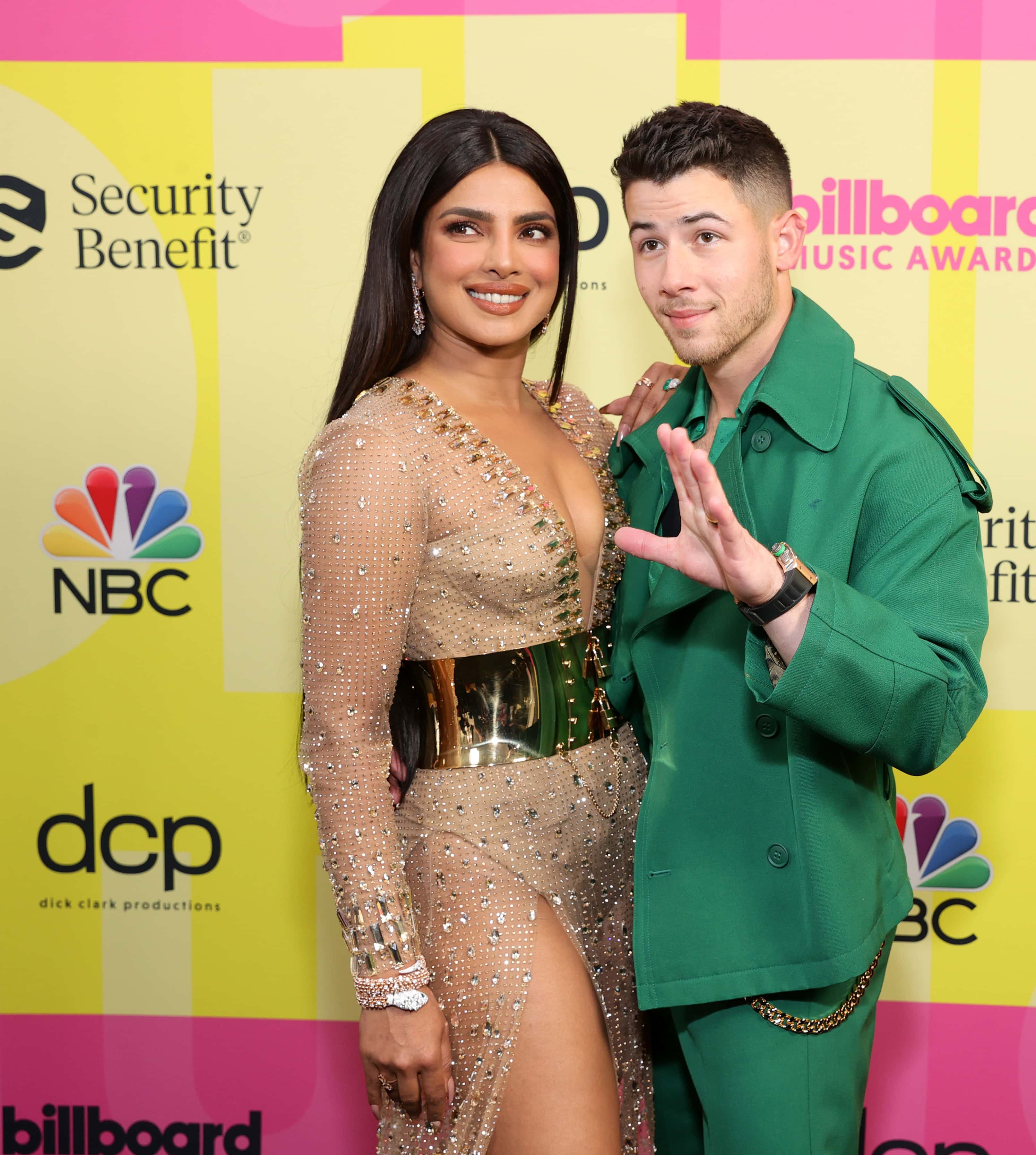 Nick Jonas, the host of Billboard Music Awards 2021, looked dreamy with wife Priyanka Chopra by his side. He sported a green Fendi suit for the Red Carpet.