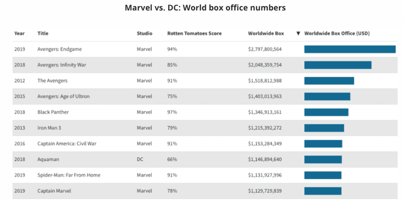 But this isn't to say that DC has not doled out hits. It's the biggest performer was 'Aquaman', which notched up 74% audience rating on Rotten Tomatoes. The last big Marvel release was 'Spider-Man: Far From Home' in 2019 with a 95% audience rating. Moving on the next factor, BO numbers. It's 2-0 for Marvel as they clearly stand undefeated as far as making the big bucks is concerned.