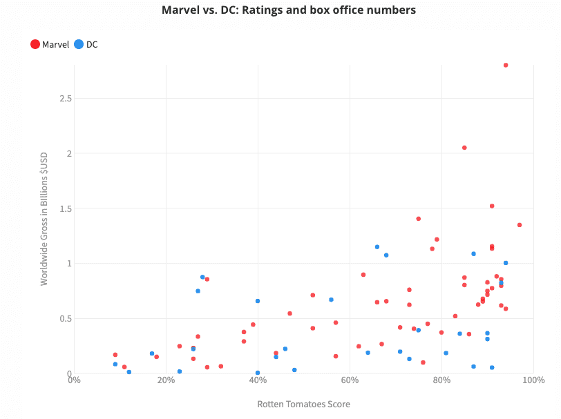 Well, as far as competition goes, both franchises have their dedicated fan base across the world, with Marvel definitely being the topper when it comes to trumping DC with respect to box office numbers, ratings and returns on investment. Reviews.org was kind enough to share some stats that lend proof that Marvel was well-ahead of the curve when it comes to the Marvel vs DC battle. The site combined the ratings of films from both franchises over the years.