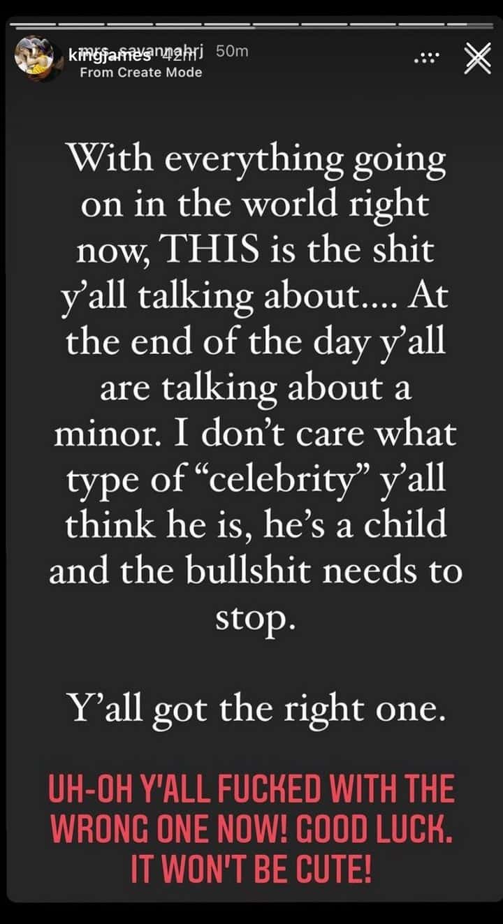 Bronny's mother Savannah hit back at the blogs in question for targeting a minor, posting on her Instagram stories: "With everything going on in the world right now, this is the s**t y'all talking about. At the end of the day y'all are talking about a minor. I don't care what type of 'celebrity' y'all think he is, he's a child and the bullshit needs to stop. Y'all got the right one." LeBron too resonated with his wife's sentiments of anger, adding a little reminder to not f*** with the 'wrong one'. He shared Savannah's post with the additional note: "Uh oh y'all f**ked with the wrong one now! Good luck. It won't be cute!" so he penned.