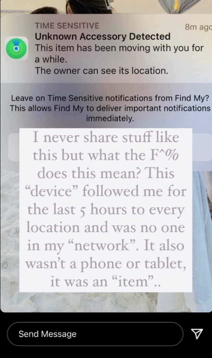 The Sports Illustrated model wrote alongside the screenshot, "I never share stuff like this but what the F does this mean. This device followed me for the last five hours to every location and there was no one in my network. It also wasn't a phone or tablet, it was an item." She warned her followers about the dangers of the tracker, stating that anyone could slip one into their pockets and can use it to track their movements.