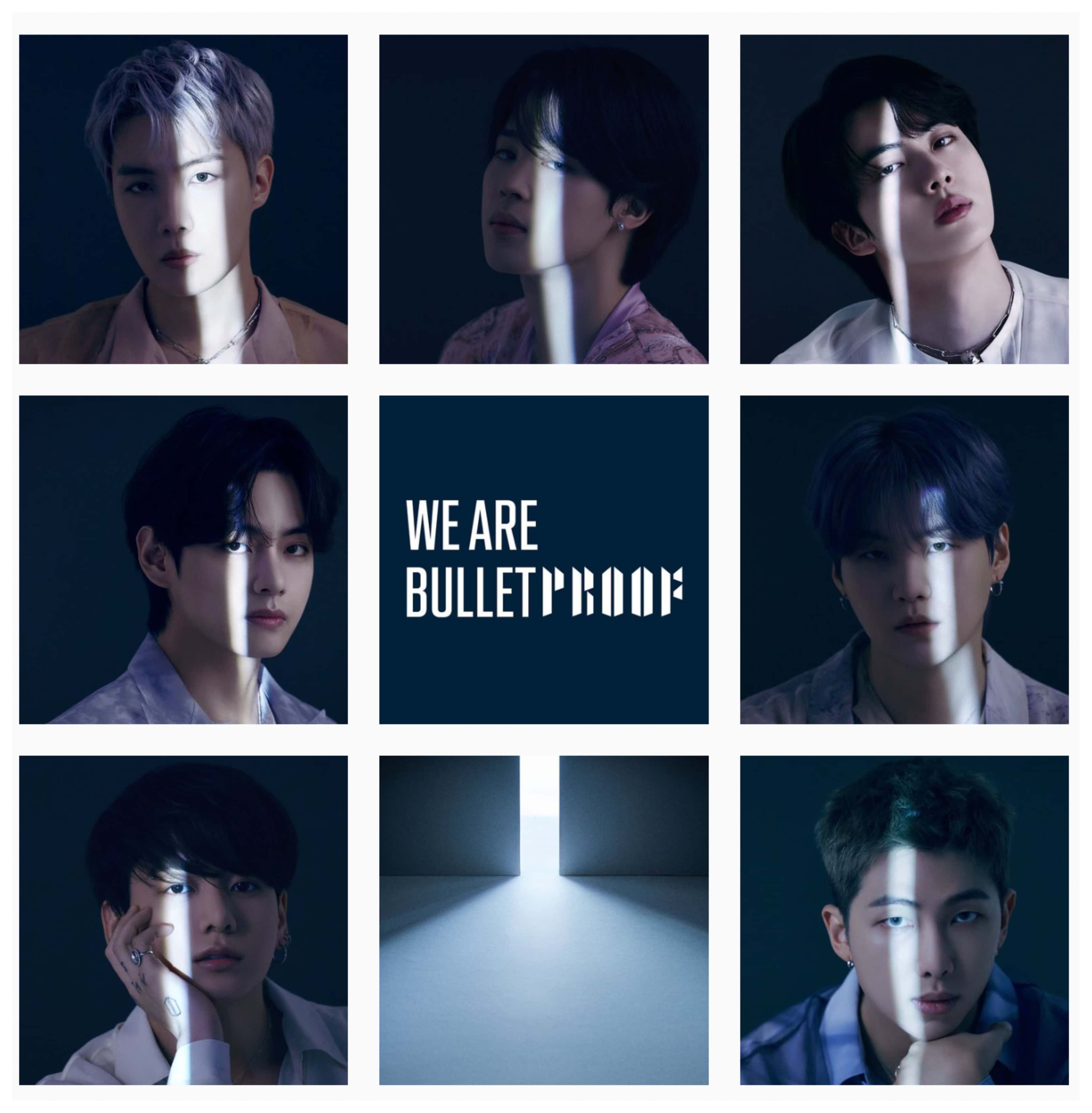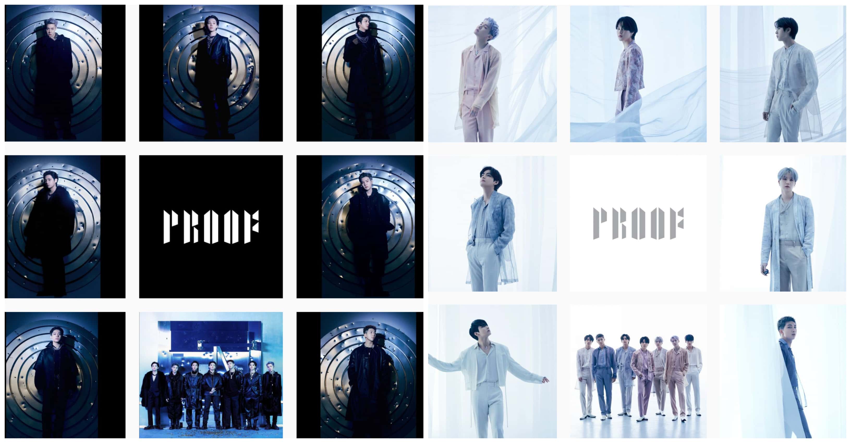 Over the period of their promotion of the album, Big Hit Music has released two concept photo versions for 'Proof'. The first version is called, 'Proof' whereas the second version is called, 'Door'. Each of the two concepts had a total of 15 unique images featuring BTS members. The first concept photo included solo shots as well as a group shot of BTS members standing in front of what looked like a bulletproof gate with a lot of pellet marks. The dark and gothic outfits mimicked the boy group's debut concept photos and were nostalgic to many fans. The photos suggested that BTS was bulletproof and members were protecting what was behind the gate. Next, member close-up shots for the same concept were released with red laser lights to signify that BTS members were targeted by "bullets" aka gunshots.