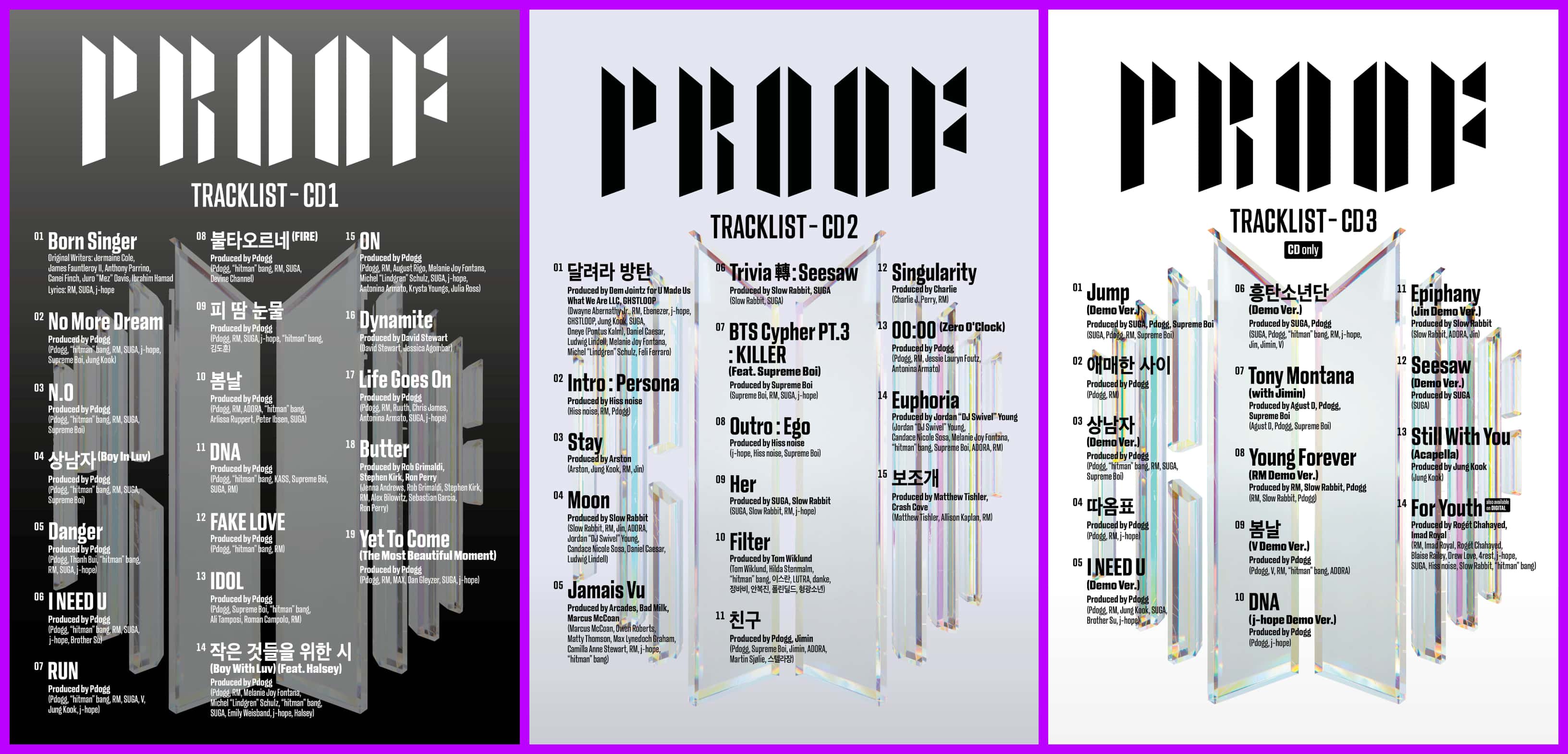 The third track is special to BTS ARMY as it includes 8 Demo versions of BTS' hit songs. The third CD for 'Proof' also includes fans' favorite rap song, 'Tony Montana' featuring Jimin as well as maknae Jungkook's best released hit, 'Still With You' in an acapella version.