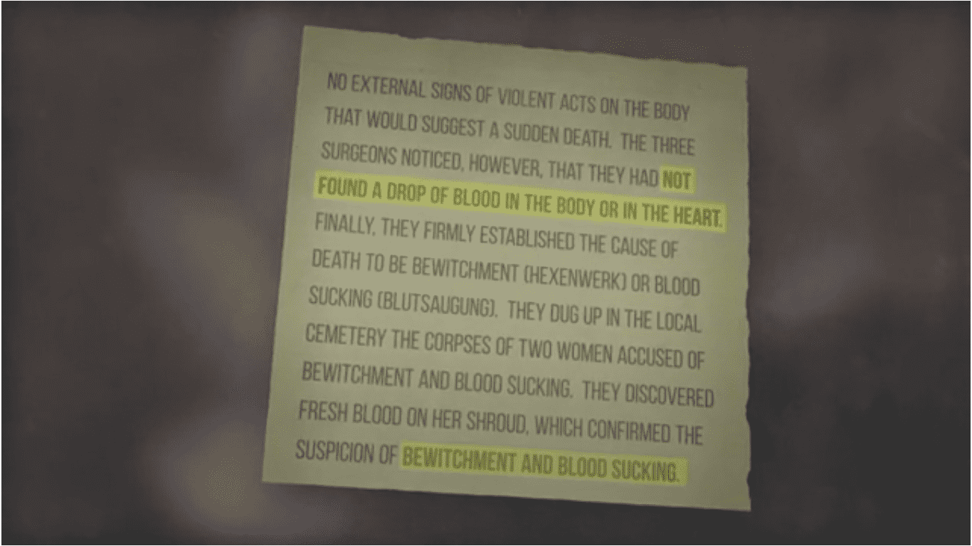 Wildman meets with historians at the county library in Szeged, who provide him with 300-year-old meeting records of the City Council that may have some answers to his questions pertaining to the existence of vampires in Eastern Europe. The manuscripts particularly contain sentences and testimonies connected to the 1728 witch trials. The main accusations against witches that led to the trials were their affiliation with the devil and some were even involved in practices that used blood. Wildman flicks through the record and finds an autopsy report of a victim who had no obvious external injuries, but his heart had been drained of blood. The cause of death had been ruled out as 'bewitchment and blood-sucking'.