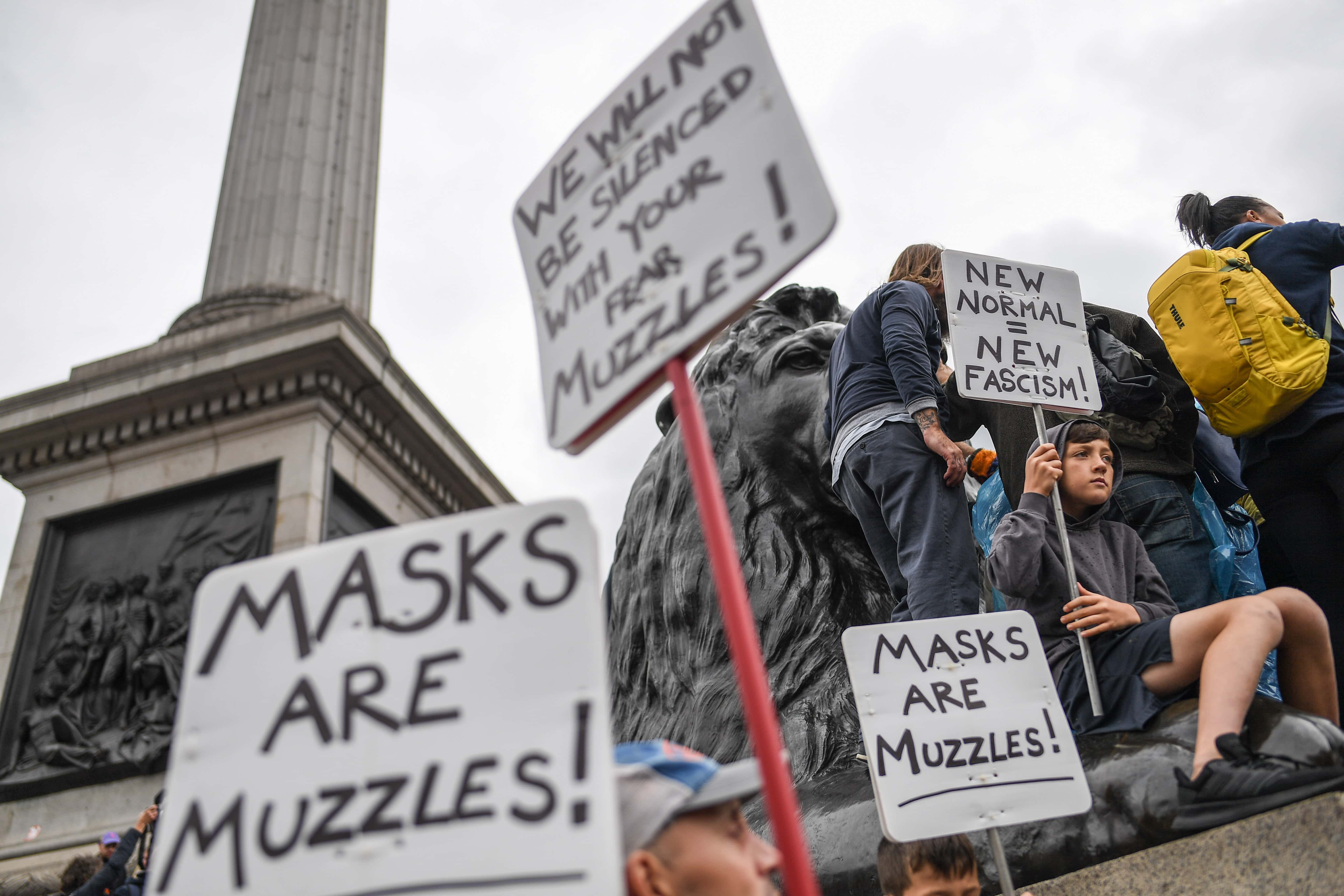 Anti-mask protesters participate in the Unite for Freedom protest in Trafalgar Sq on August 29, 2020 in London, England. (Peter Summers/Getty Images)