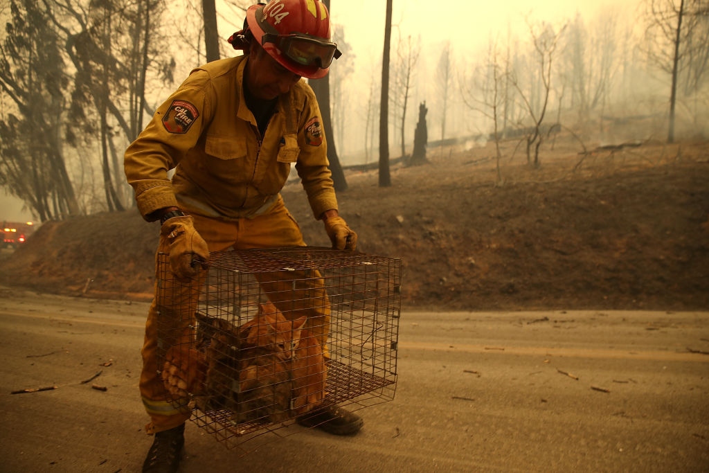 Cal Fire Captain Steve Millosovich carries a cage full of cats that were found in the road after the Camp Fire moved through the area on November 9