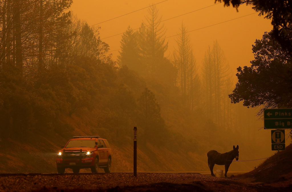 A rescued donkey stands tied to a road sign on the side of the road after the Camp Fire moved through the area on November 9 (Getty Images)