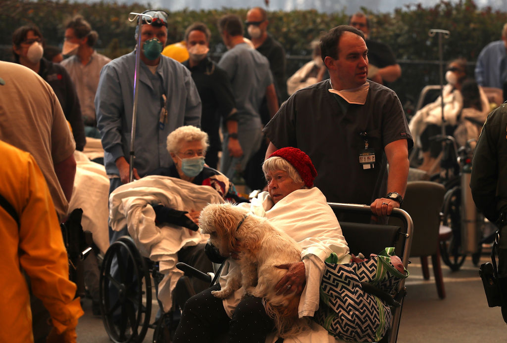 Hospital workers and first responders evacuate patients from the Feather River Hospital as the Camp Fire moves through the area on November 8 (Getty Images)