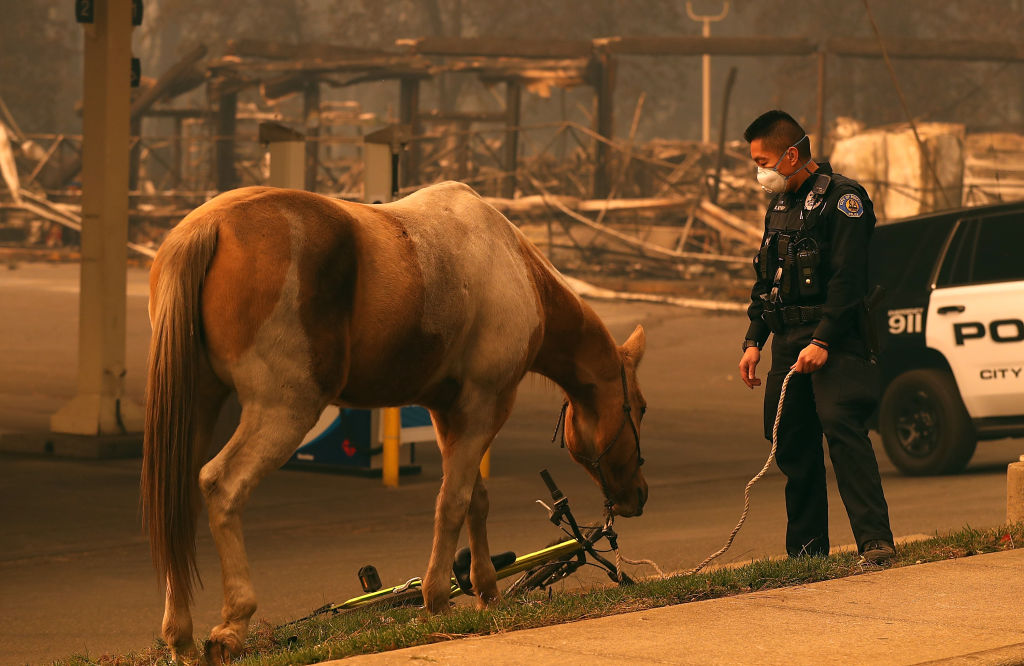 Rocklin police officer Randy Law tends to a horse that was found wandering after the Camp Fire moved through the area on November 9, 2018 in Paradise (Getty Images)