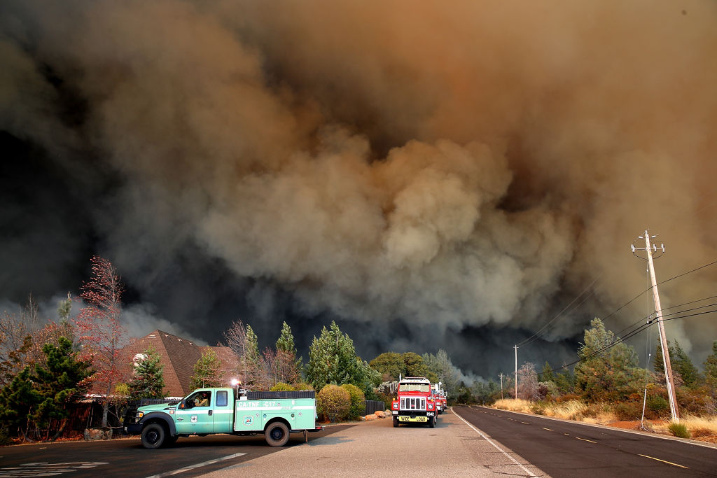 A plume of smoke rises above the Camp Fire as it moves through the area on November 8, 2018 in Paradise, California. The fire began early on Thursday and was the fiercest of several wind-driven blazes across California, in one of the worst years for wildfires in the state. (Getty Images)