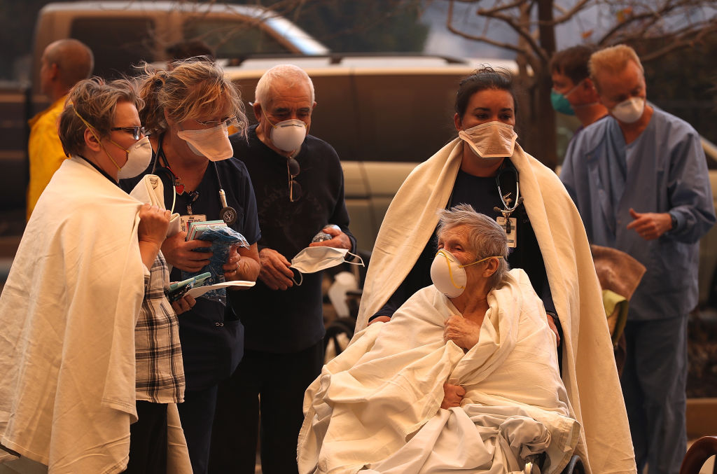 Hospital workers and first responders evacuate patients from the Feather River Hospital as the Camp Fire moves through the area on November 8, 2018 in Paradise, California. (Getty Images)