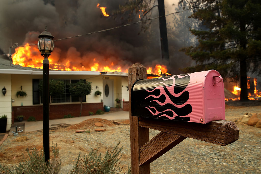 A mailbox with flames painted on it is posted in front of a burning home as the Camp Fire moves through the area on November 8, 2018 in Paradise, California. In Paradise, located on a ridge and with limited escape routes, traffic accidents turned roads into gridlock. That prompted residents to abandon their vehicles and run from the flames, carrying children and pets, officials said. (Getty Images)