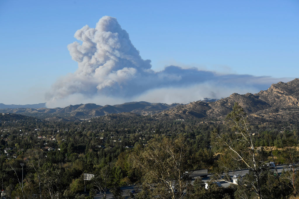 The Woolsey Fire is seen looking towards the west valley area on November 9, 2018 in Porter Ranch, California. About 75,000 homes have been evacuated in Los Angeles and Ventura counties due to two fires in the region. Strong winds were expected in the mountains and valleys of Ventura County and in coastal areas, the NWS said. Those winds had already help double the size of the Woolsey Fire to 8,000 acres, fire officials said. (Getty Images)