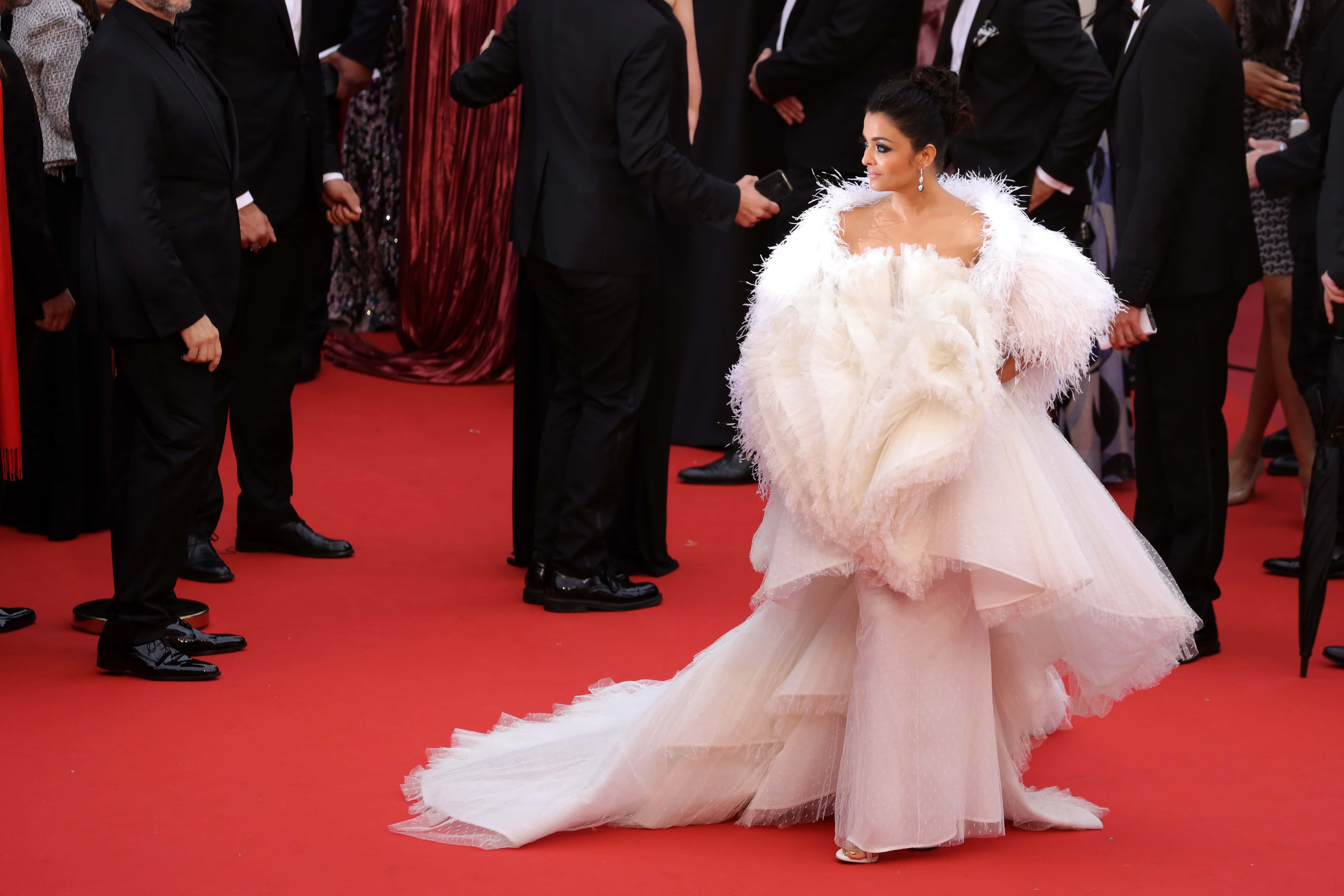 Aishwarya Rai Bachchan rocked a classic white look in the ruffled embellished fur-cape custom designed by Ashi Studio at the premiere of 'La Belle Epoque'. Well, one might wonder how someone would sit in an outfit like that but, in all honesty, we'd give up sitting just to flaunt those plumes.