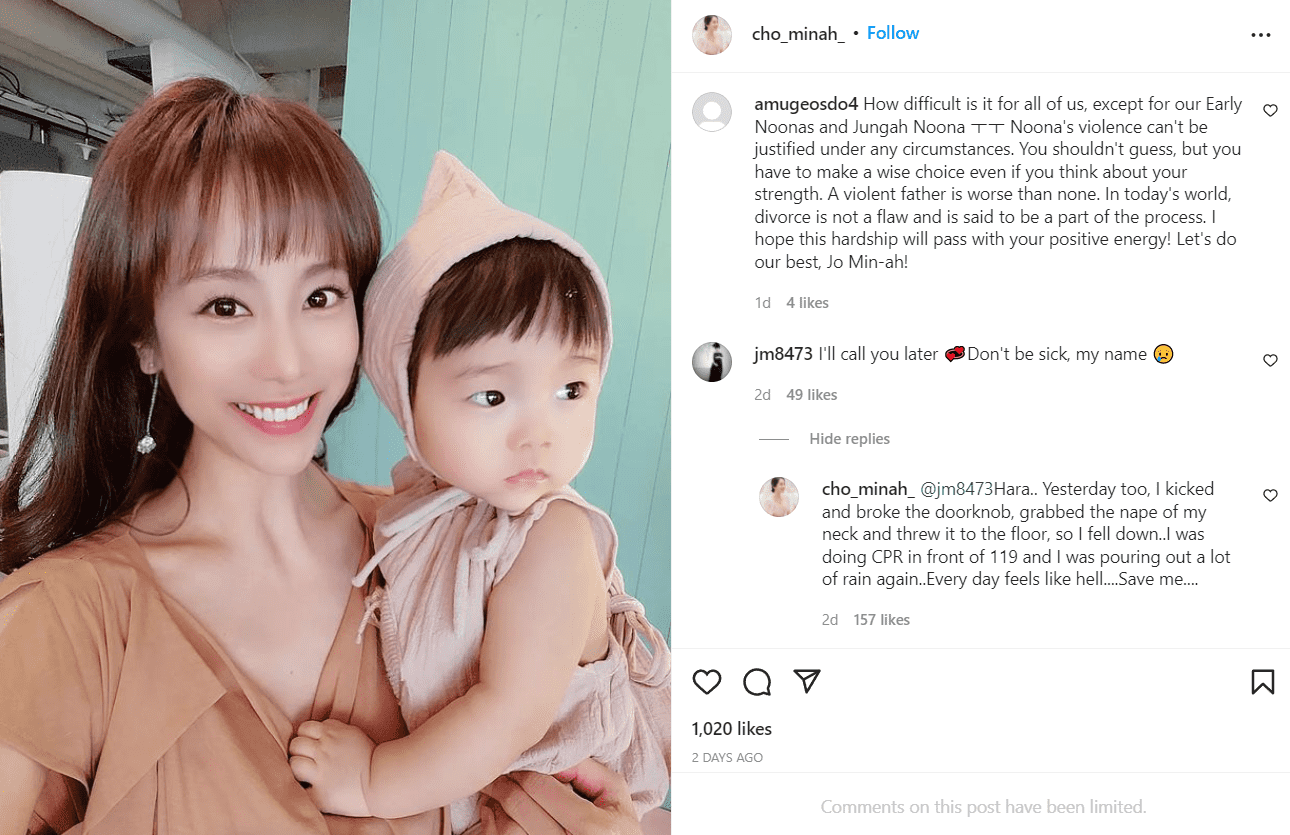 On May 16, Cho Min-ah posted a photo with her son, Kang-ho and shared that while he was sleeping, she was being suffocated till she was thrown to the floor and lost consciousness. She added that the paramedics and even the police arrived and fortunately she was fine when her son woke up. While many users thought that it was a case of hyperventilation, Min-ah hinted that something sinister might have happened. To a fan's comment who asked if she was alright, the former Jewelry member commented, “When the paramedics came, he was already performing CPR, and when they were gone, he cursed at me again. Every day feels like hell. Save me.”