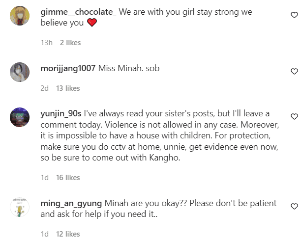 However, after Min-ah’s May 17 post, fans and non-fans are afraid for her and are sending her supportive messages. One fan commented, “We are with you girl stay strong we believe you.” Another said, “I've always read your posts, but I'll leave a comment today. Violence is not allowed in any case. Moreover, it is impossible to have [such] a house with children. For protection, make sure you have CCTV at home, sister, get evidence even now, and be sure to come out with Kang-ho.” One fan asked, “Min-ah are you okay?? Please don't be patient and ask for help if you need it.”