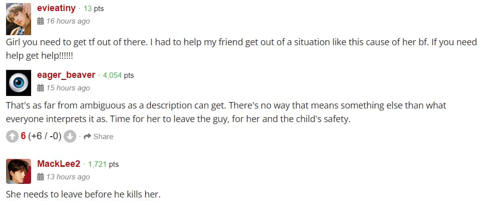 Another said, “Girl you need to get tf out of there. I had to help my friend get out of a situation like this cause of her bf. If you need help get help!!!!!!” Another added, “That's as far from ambiguous as a description can get. There's no way that means something else than what everyone interprets it as. Time for her to leave the guy, for her and the child's safety.” One fan was worried, “She needs to leave before he kills her.”