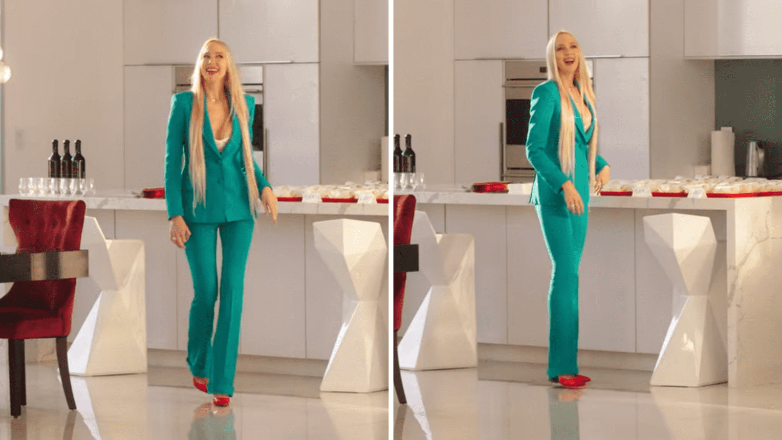 For her 'Botox and burgers' themed open house, Christine chose a beautiful turquoise blue suit and bright orange pumps. It’s really amazing when women can pull off bright coloured suits, the perfect combination of professional and playful. With a plunging neckline and her long blonde hair straightened and left open, Christine looked sharp.