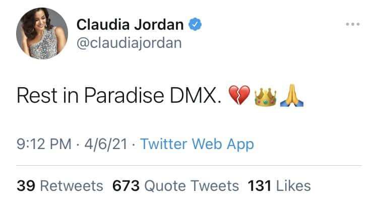 Jordan tweeted, "Rest In Paradise DMX," alongside broken heart, crown and folded hands emojis on April 7. Within minutes, she realized her mistake and deleted the tweet and posted another tweet saying, "I'm sorry" along with a folded hands and broken heart emoji.