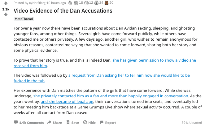 r/rantGrumps, which is a subreddit that criticizes The Game Grumps, a YouTube gaming comedy group, saw a post from a user that reportedly contained evidence that was shared with them by an alleged victim of Avidan.