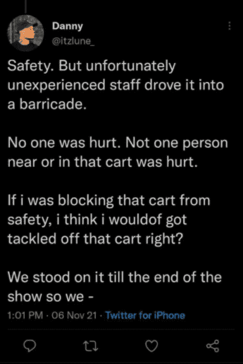 Later on, he also defended himself on Twitter in a post, writing, "Safety. But unfortunately, inexperienced staff drove it into a barricade. No one was hurt. Not one person near or in that cart was hurt. If I was blocking that cart from safety, I think I wouldof (sic) got tackled off that cart right? We stood on it till the end of the show so we --"