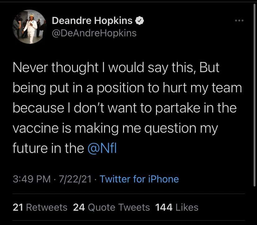 DeAndre Hopkins, the wide receiver for the Arizona Cardinals has threatened to quit the NFL if forced to get vaccinated. On July 22, the player put up a now-deleted tweet, followed later by an ominous "freedom" tweet. Fans have put two and two together and trolled Hopkins (also known as DHop) for his anti-vaccine stance.