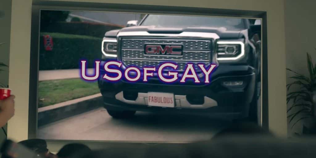 One particular clip from the trailer shows five men with a token black guy walking into the college premises in the signature 'Queer Eye' style. We then see Sam turning on the TV screen to reveal a title card that reads the name of a show called 'US of Gay.' Following that, the black GMC road truck with the number plate that reads: ‘Fabulous’ arrives at an obviously racist white person's house, who feels the need to flag and flaunt their confederate flag from all of their windows. The scene cuts to indoors where a man clad in posh suits and boots can be seen rummaging through the closet of the racist homeowner, before pulling out a Ku Klux Klan mask and robe.