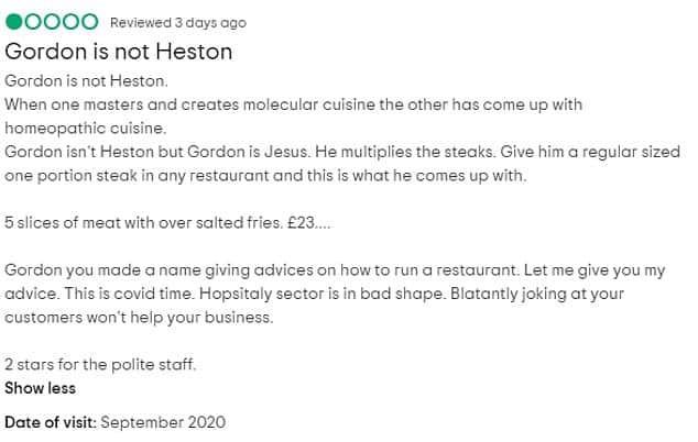 "When one master and creates molecular cuisine the other has come up with homeopathic cuisine," the diner wrote. "Gordon isn't Heston but Gordon is Jesus. He multiples the steaks. Give him a regular-sized one portion steak in any restaurant and this is what he comes up with."