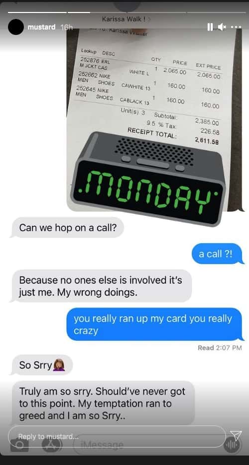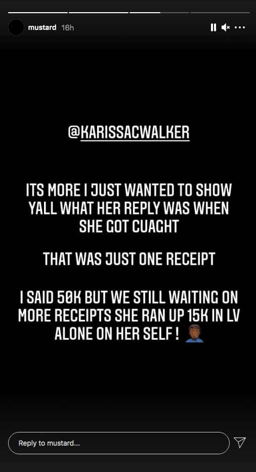“Attention to all my people who know me I wanna bring something up to everyone's attention! @KarissaCWalker is a thief and a liar !!!! She is not my stylist she was a personal shopper for me and @ChanelDijon we let her use the stylist word so she could get business but the truth is she did nothing but shop!!!” Mustard wrote in one of his IG stories.