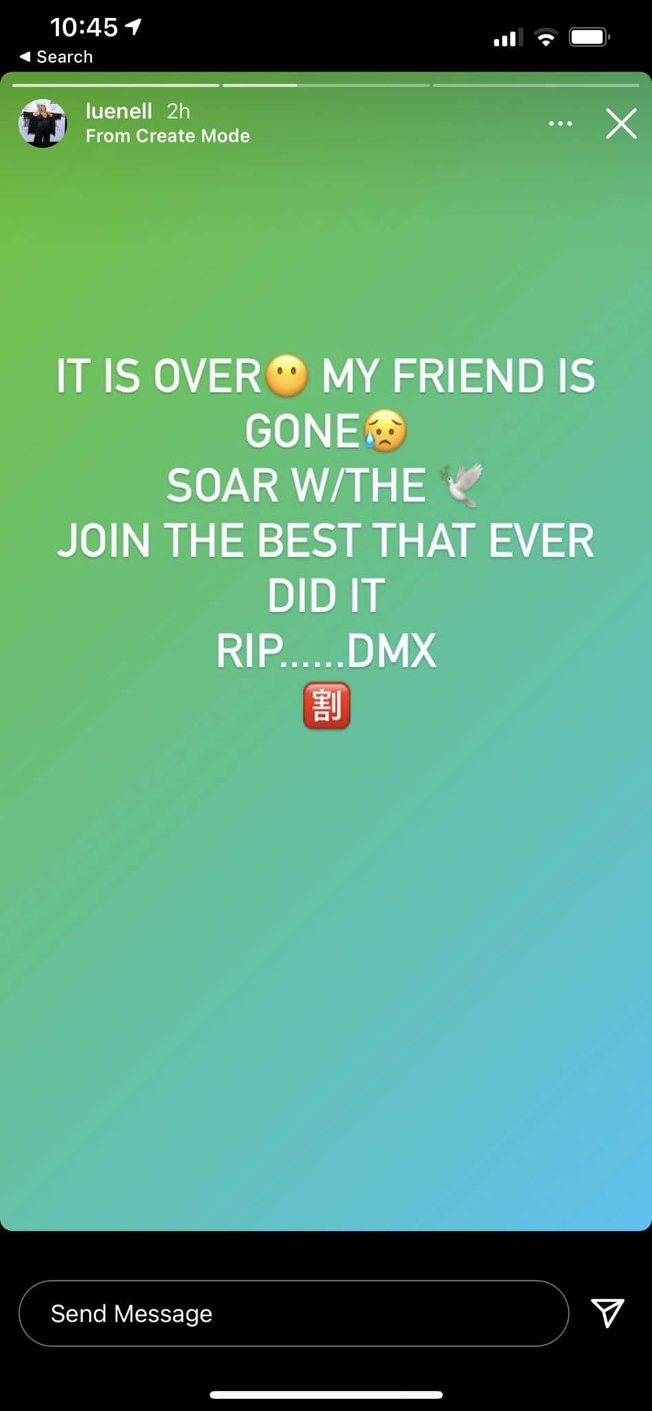 Around two hours ago, comedian Luenell posted a note on her Instagram story that said, "It is over. My Friend is Gone" and included "RIP DMX."