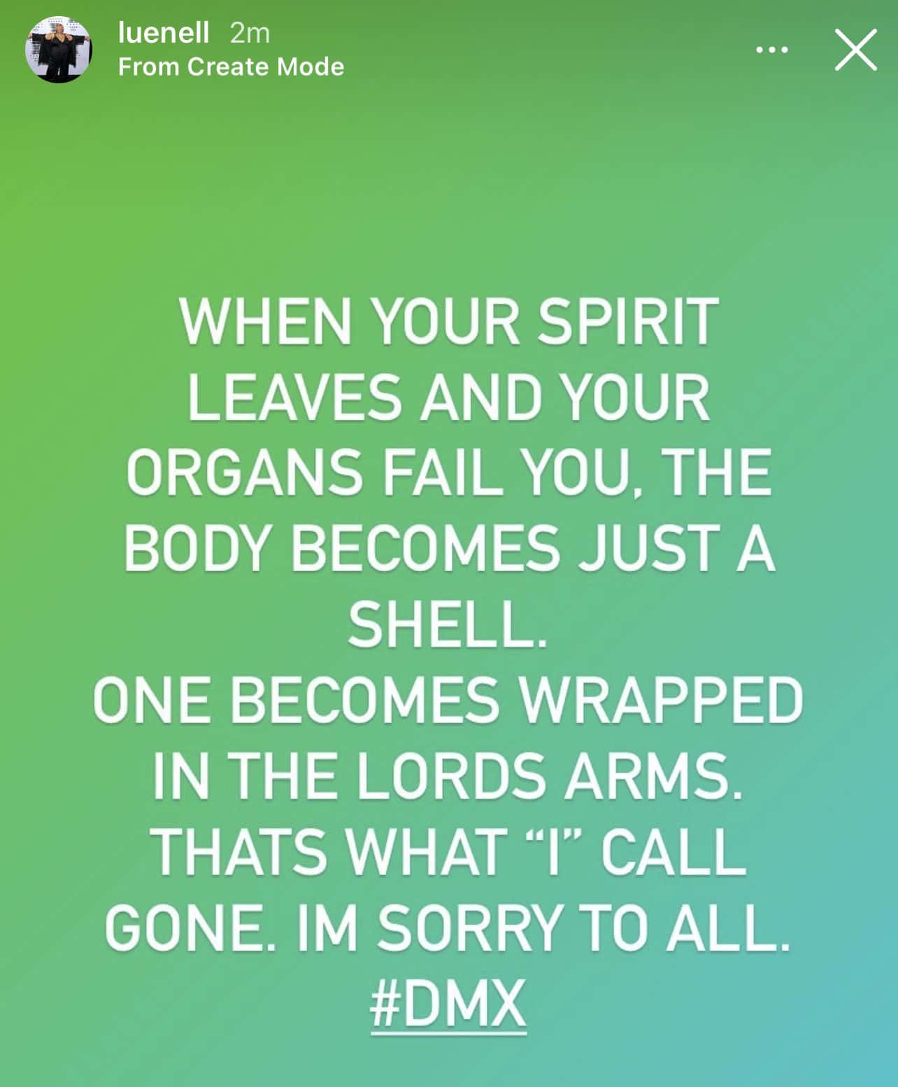 However, neither the news was confirmed by any major media outlets nor did his family release any official statement, which led many to speculate if the news was another false hoax. Soon afterward, Luenell deleted her original Instagram story and uploaded an apology post, saying, "When your spirit leaves and your organs fail you, the body becomes just a shell. One becomes wrapped in the Lords arms. Thats what 'I' call gone. IM sorry to all. #DMX"