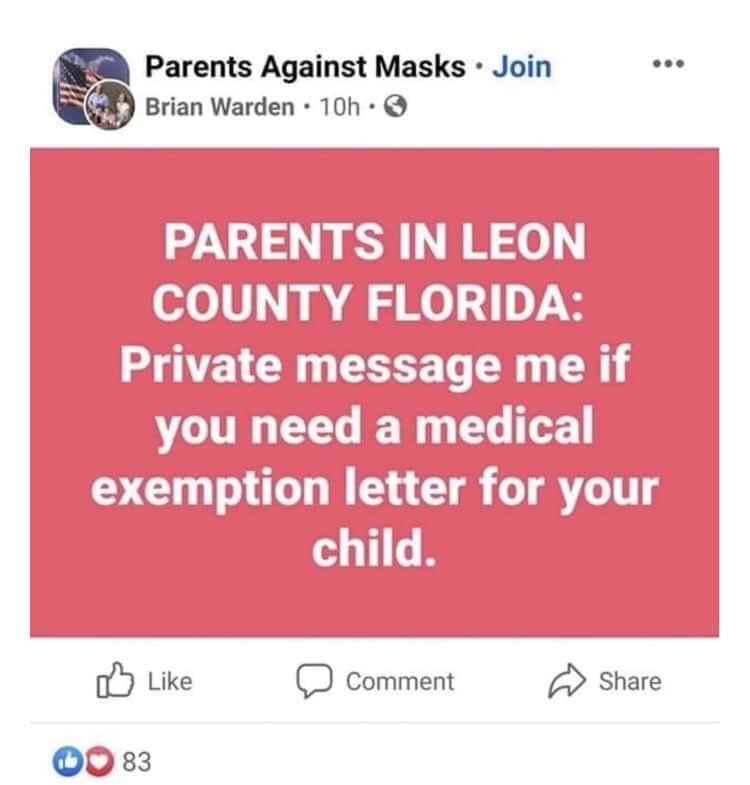Warden posted the service he was offering on an anti-mask Facebook group 'Parents Against Masks'. In one post, he said, "I'm not doing this affiliated with any hospital or group. I'm doing this under DOVE FIELD HEALTH LLC." In another, he said, "I think Facebook is thinking I am getting scammed or something. I can't see any more messages." These comments came after Warden posted "Parents in Leon County Florida: private message me if you need a medical exemption letter for your child." He was reportedly offering the exception letters for $50. Having such a letter is one of the only ways parents can have their child exempted from a mask mandate.