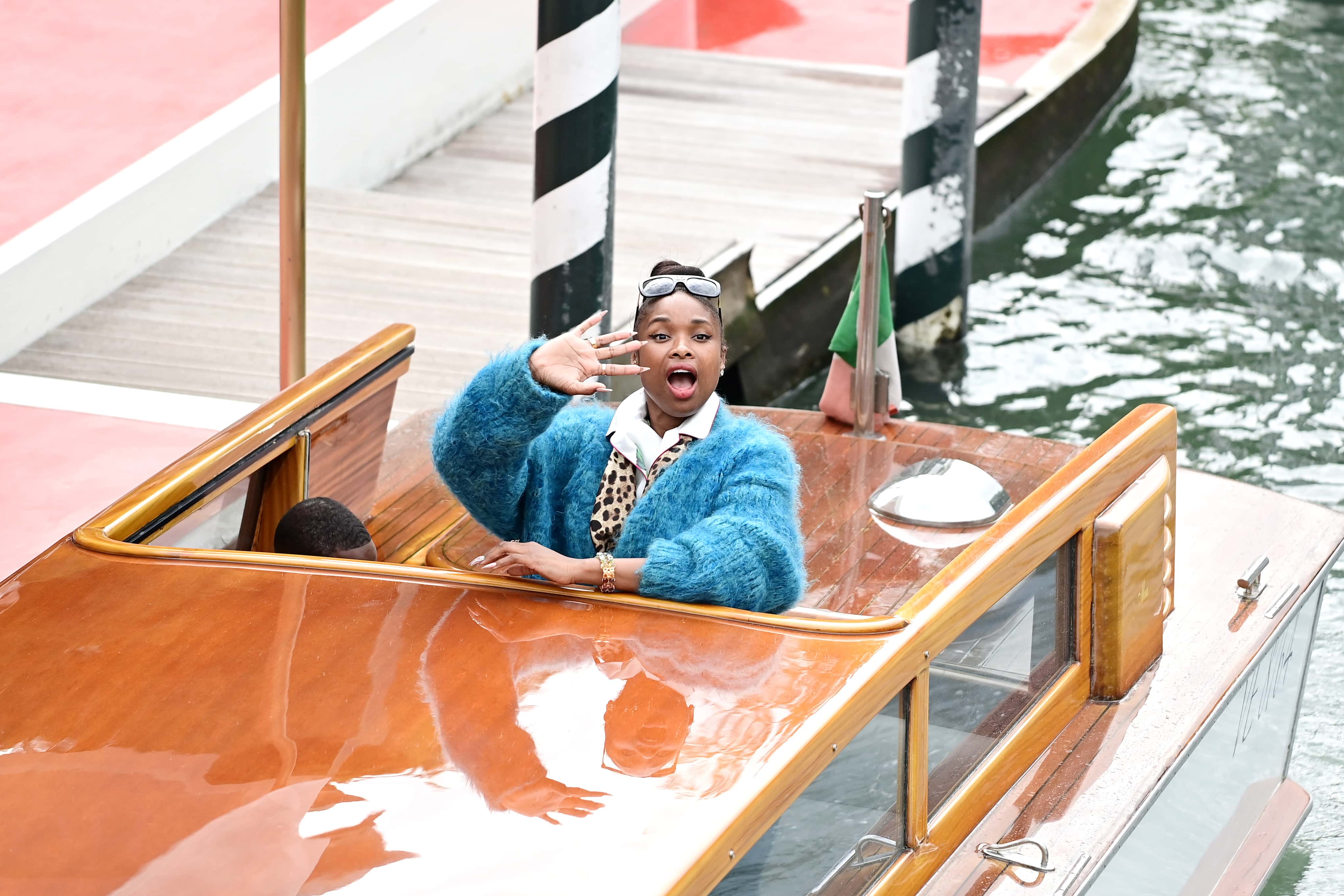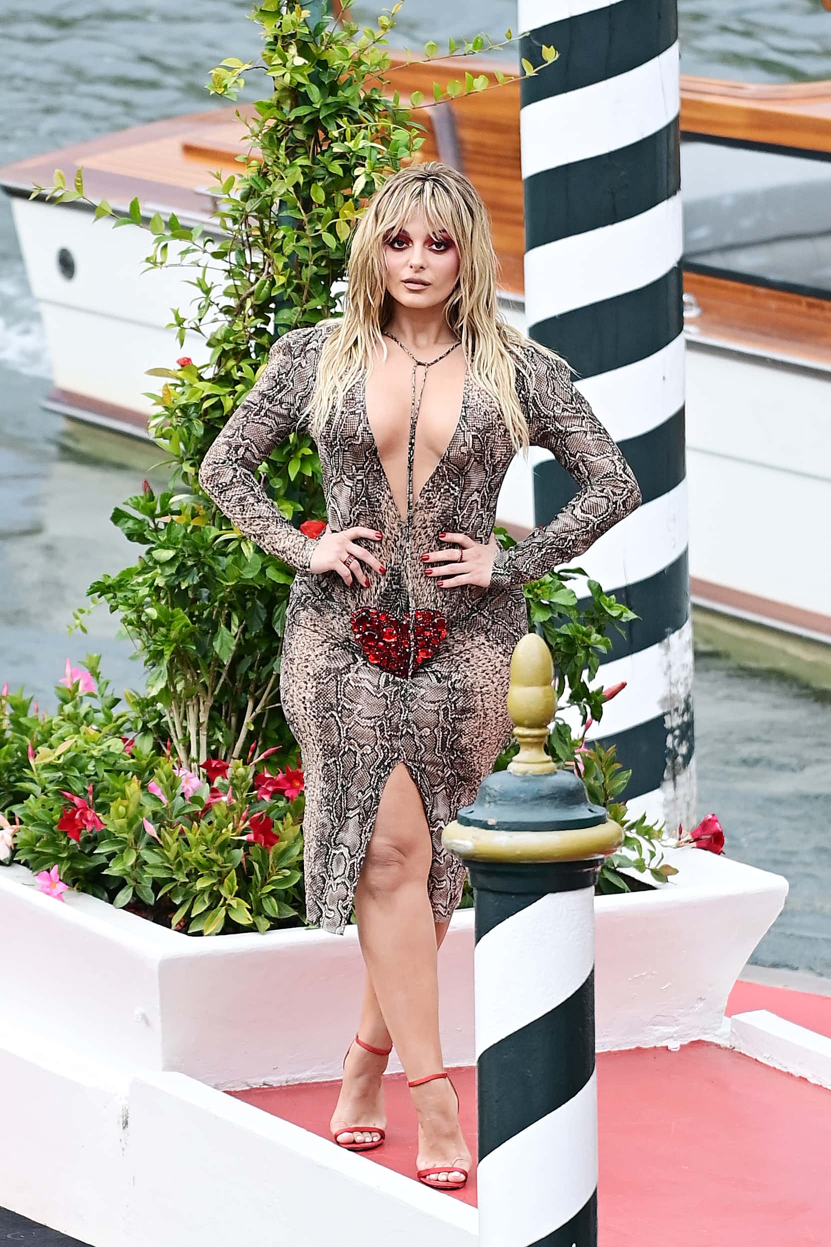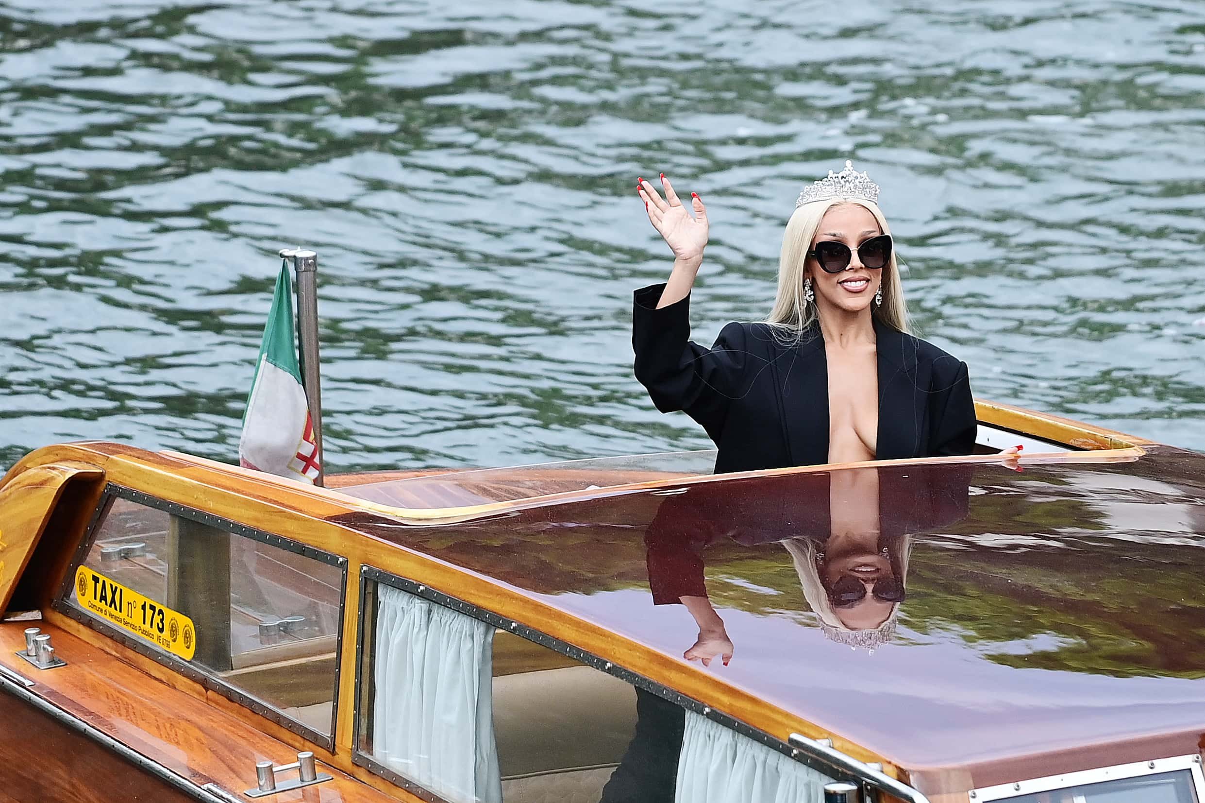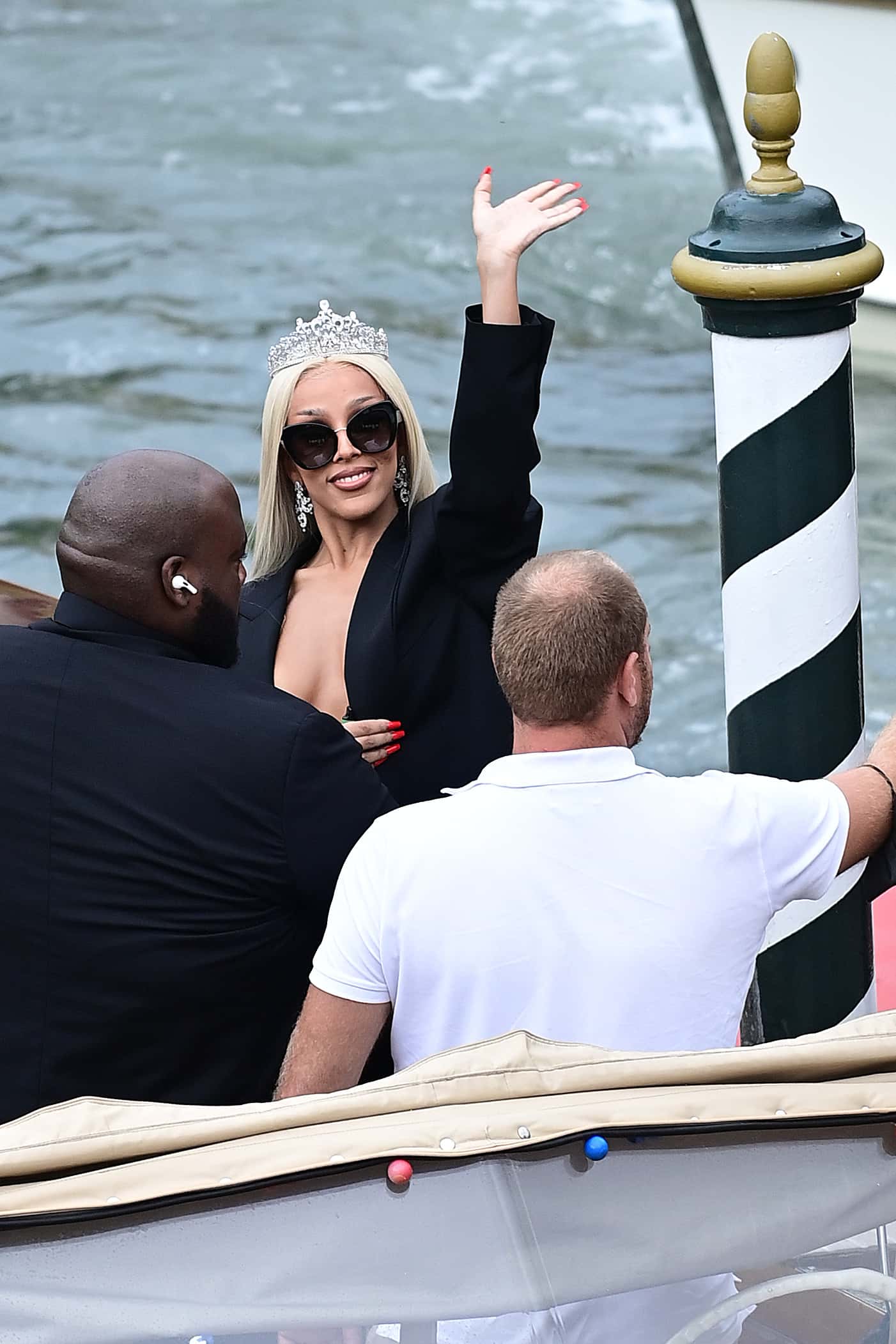 The songstress topped her long platinum locks with a diamond tiara and wore chandelier earrings to add a touch of glitz. The 'Need To Know' singer also sported oversized sunglasses while waving to the crowd. Flaunting a significant amount of cleavage as she arrived by water taxi, her suit appeared to be taped to her body. This was why she avoided the wardrobe malfunction when she was trying to get off the boat. Doja Cat received last-minute touch-ups from her make-up team before she posed stone-faced for the cameras.