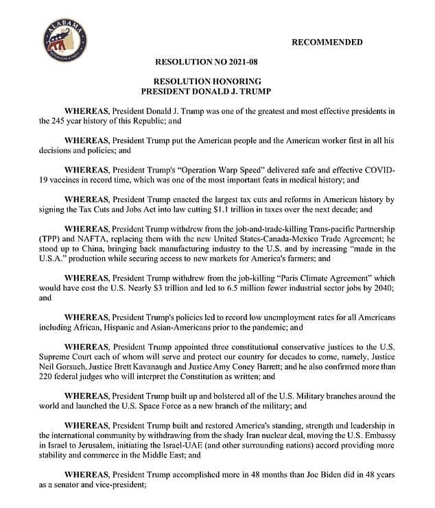 Aside from Hooper, the resolution was signed by Col James Henderson of Morgan County, Linda Overton of Houston County, Dennis Beavers of Blount County, Suzelle Joscy of Autauga County, Jcana Boggs of Elmore County, John Killian of Fayette County, and Ann Bennett of Lee County.